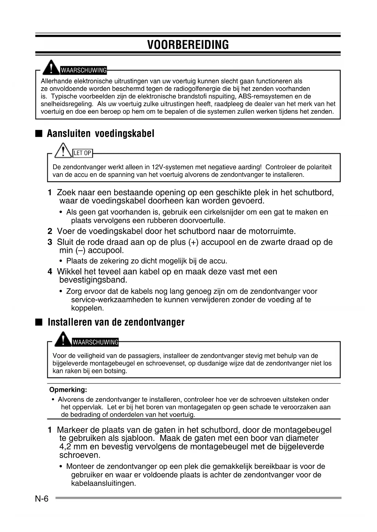 - Microfoonhaak (met plaatschroef 4 x 16 mm). . . . . . . . . . . . . . . . . . . . . . . . . . . . . . . . . . . . . . . 1 Gebruikershandleiding . . . . . . . . . . . . . . . . . . . . . . . . . . . . . . . . . . . . . . . . . . . . . . . . . 1N-6 VOORBEREIDING WAARSCHUWING Allerhande elektronische uitrustingen van uw voertuig kunnen slecht gaan functioneren als ze onvoldoende worden beschermd tegen de radiogolfenergie die bij het zenden voorhanden is. Typische voorbeelden zijn de elektronische brandstofi nspuiting, ABS-remsystemen en de snelheidsregeling. Als uw voertuig zulke uitrustingen heeft, raadpleeg de dealer van het merk van het voertuig en doe een beroep op hem om te bepalen of die systemen zullen werken tijdens het zenden. ■ Aansluiten voedingskabel LET OP De zendontvanger werkt alleen in 12V-systemen met negatieve aarding! Controleer de polariteit van de accu en de spanning van het voertuig alvorens de zendontvanger te installeren. 1 Zoek naar een bestaande opening op een geschikte plek in het schutbord, waar de voedingskabel doorheen kan worden gevoerd.