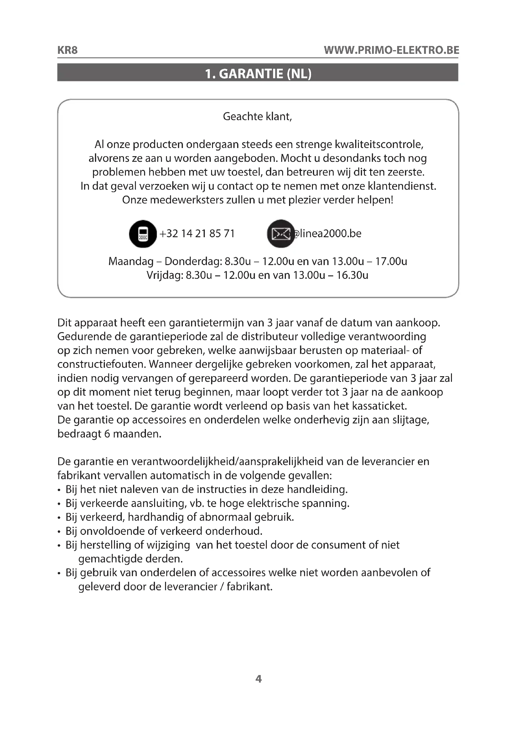 Geachte klant, Al onze producten ondergaan steeds een strenge kwaliteitscontrole, alvorens ze aan u worden aangeboden. Mocht u desondanks toch nog problemen hebben met uw toestel, dan betreuren wij dit ten zeerste. In dat geval verzoeken wij u contact op te nemen met onze klantendienst. Onze medewerksters zullen u met plezier verder helpen! +32 14 21 85 71 info@linea2000.be Maandag – Donderdag: 8.30u – 12.00u en van 13.00u – 17.00u Vrijdag: 8.30u – 12.00u en van 13.00u – 16.30u Dit apparaat heeft een garantietermijn van 3 jaar vanaf de datum van aankoop. Gedurende de garantieperiode zal de distributeur volledige verantwoording op zich nemen voor gebreken, welke aanwijsbaar berusten op materiaal- of constructiefouten. Wanneer dergelijke gebreken voorkomen, zal het apparaat, indien nodig vervangen of gerepareerd worden. De garantieperiode van 3 jaar zal op dit moment niet terug beginnen, maar loopt verder tot 3 jaar na de aankoop van het toestel. De garantie wordt verleend op basis van het kassaticket. De garantie op accessoires en onderdelen welke onderhevig zijn aan slijtage, bedraagt 6 maanden. De garantie en verantwoordelijkheid/aansprakelijkheid van de leverancier en fabrikant vervallen automatisch in de volgende gevallen: