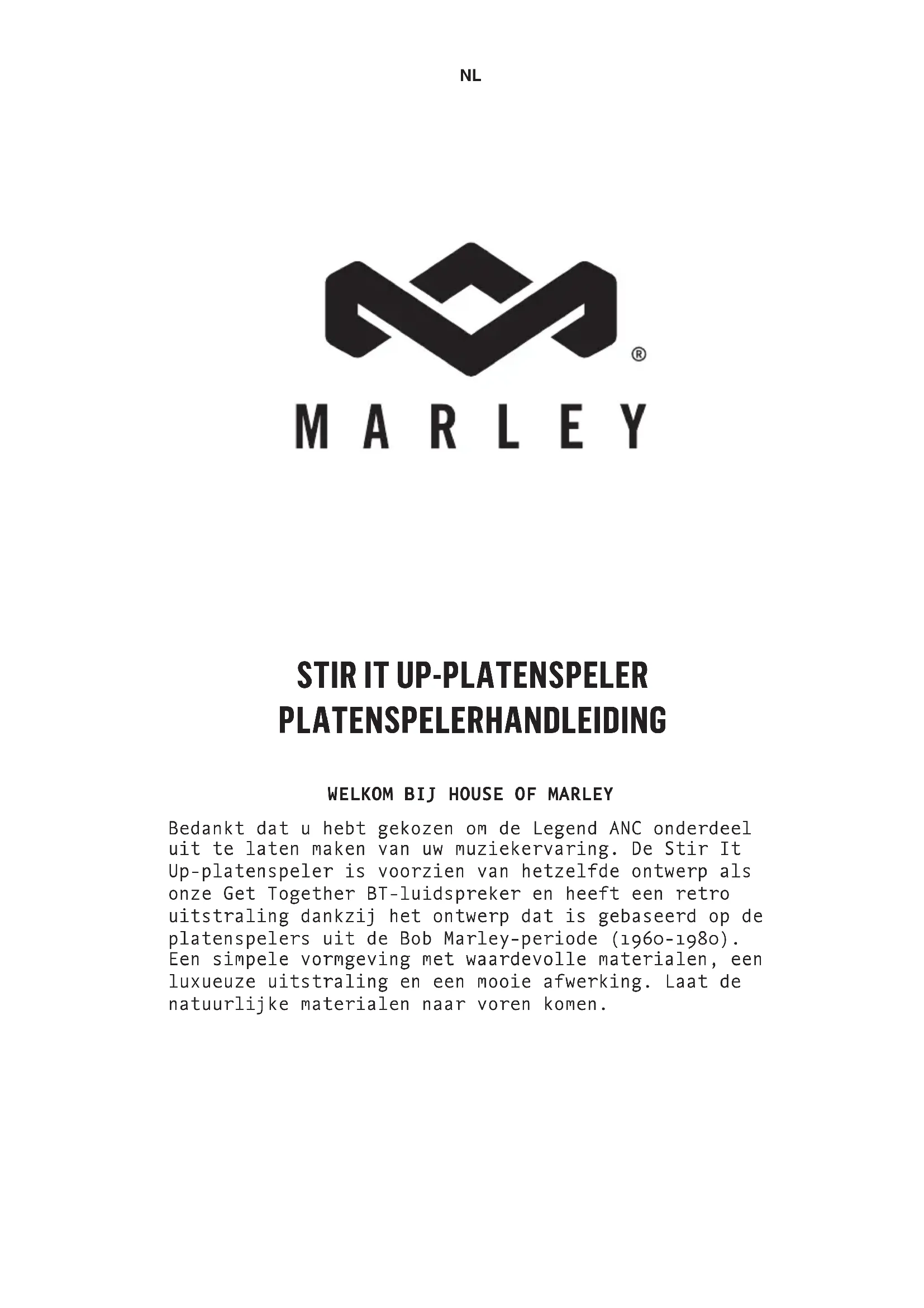 Bedankt dat u hebt gekozen om de Legend ANC onderdeel uit te laten maken van uw muziekervaring. De Stir It Up-platenspeler is voorzien van hetzelfde ontwerp als onze Get Together BT-luidspreker en heeft een retro uitstraling dankzij het ontwerp dat is gebaseerd op de platenspelers uit de Bob Marley-periode (1960-1980). Een simpele vormgeving met waardevolle materialen, een luxueuze uitstraling en een mooie afwerking. Laat de natuurlijke materialen naar voren komen. NLNL