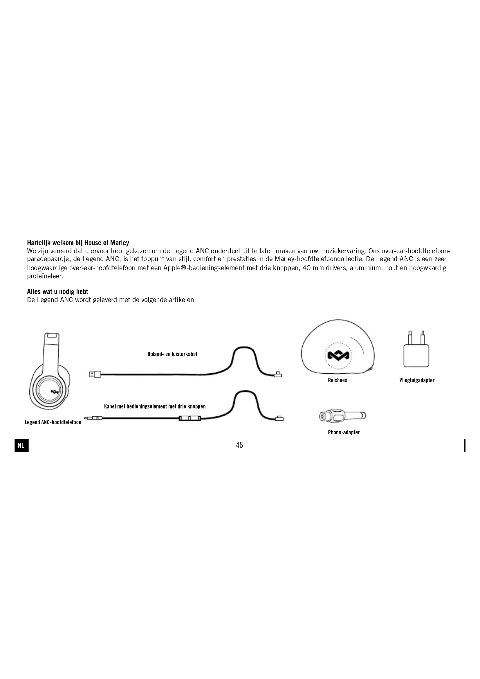 Hartelijk welkom bij House of Marley We zijn vereerd dat u ervoor hebt gekozen om de Legend ANC onderdeel uit te laten maken van uw muziekervaring. Ons over-ear-hoofdtelefoon- paradepaardje, de Legend ANC, is het toppunt van stijl, comfort en prestaties in de Marley-hoofdtelefooncollectie. De Legend ANC is een zeer hoogwaardige over-ear-hoofdtelefoon met een Apple®-bedieningselement met drie knoppen, 40 mm drivers, aluminium, hout en hoogwaardig proteïneleer. Alles wat u nodig hebt De Legend ANC wordt geleverd met de volgende artikelen: Legend ANC-hoofdtelefoon Kabel met bedieningselement met drie knoppen Oplaad- en luisterkabel Reishoes Phono-adapter Vliegtuigadapter47 Genieten van uw Legend ANC De Legend ANC-hoofdtelefoon kan worden gebruikt met de actieve ruisonderdrukkende functie “AAN” (ON) of “UIT” (OFF). Om de actieve ruisonderdrukkende functie “AAN” (ON) te zetten, schuift u de schakelaar op uw rechterhoofdtelefoon naar boven. Het lampje gaat branden om aan te tonen dat de actieve ruisonderdrukkende functie actief is. De technologie in uw Legend ANC zal actief ongewenst geluid van buitenaf verminderen, terwijl gelijktijdig de details en de kracht te horen zijn die uw muziek verdient. Als de schakelaar “AAN” (ON) staat, zal het ledlampje van de batterij-indicator oplichten om het batterijniveau weer te geven. Het opladen van uw apparaat Gebruik de laadkabel die is meegeleverd of een standaard micro- USB-kabel om de Legend ANC op te laden. De hoofdtelefoon kan worden opgeladen via de USB-poort van een computer of een USB-laadadapter. Batterij vervangen De Legend ANC komt met een oplaadbare batterij die is ontworpen om net zolang als het product zelf mee te gaan. In het onwaarschijnlijke geval dat u een nieuwe batterij nodig hebt, kunt u contact opnemen met de klantendienst. De medewerkers van de klantendienst zullen u dan informatie geven over het vervangen van batterijen, al dan niet uit hoofde van garantie. Compatibiliteit van de microfoon en het bedieningselement met drie knoppen De geïntegreerde microfoon zorgt ervoor dat u handsfree gesprekken kunt voeren. Druk op de knop om een oproep te beantwoorden en druk nogmaals om de oproep te beëindigen. De functies vorige/volgende en afspelen/pauzeren zoals op de afbeelding zijn afgebeeld werken alleen met Apple-apparaten. x1 x1