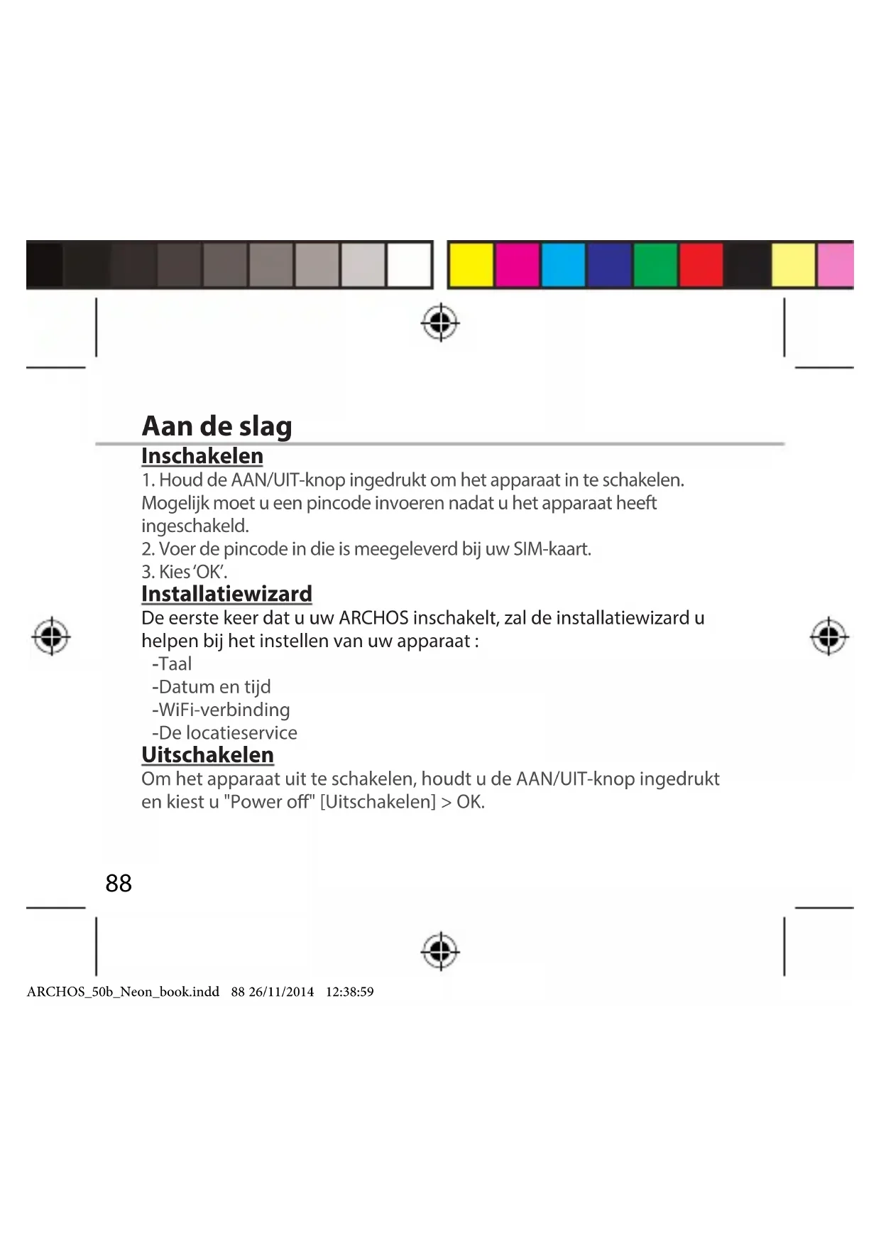 Installatiewizard De eerste keer dat u uw ARCHOS inschakelt, zal de installatiewizard u helpen bij het instellen van uw apparaat : - Taal - Datum en tijd - WiFi-verbinding - De locatieservice Uitschakelen Om het apparaat uit te schakelen, houdt u de AAN/UIT-knop ingedrukt en kiest u "Power o" [Uitschakelen] > OK. ARCHOS_50b_Neon_book.indd 88 26/11/2014 12:38:5989