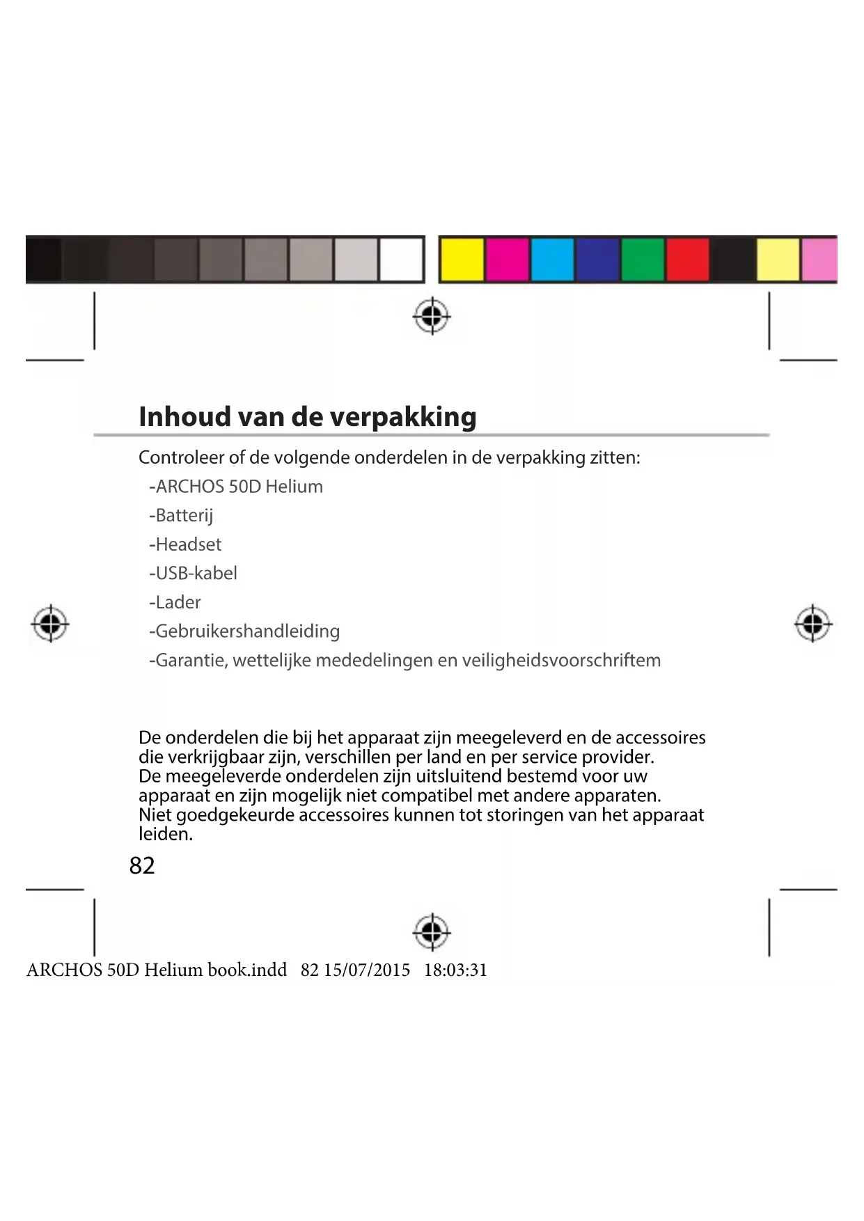 Raadpleeg voor meer informatie de veelgestelde vragen (FAQ's) op www.archos.com. Lees eerst de antwoorden op deze vragen voordat u het product terugstuurt. Uw probleem is dan mogelijk snel opgelost. Aangezien wij onze producten regelmatig updaten en verbeteren, kunnen de vormgeving en/of de functies van uw apparaatsoftware afwijken van de software in deze Verkorte handleiding. Raadpleeg de verklaring van overeenstemming op http://www.archos. com/nl-nl/support/support_tech/downloads.html ARCHOS 50D Helium book.indd 81 15/07/2015 18:03:3082 Inhoud van de verpakking Controleer of de volgende onderdelen in de verpakking zitten: - ARCHOS 50D Helium - Batterij - Headset - USB-kabel - Lader - Gebruikershandleiding - Garantie, wettelijke mededelingen en veiligheidsvoorschriftem De onderdelen die bij het apparaat zijn meegeleverd en de accessoires die verkrijgbaar zijn, verschillen per land en per service provider. De meegeleverde onderdelen zijn uitsluitend bestemd voor uw apparaat en zijn mogelijk niet compatibel met andere apparaten. Niet goedgekeurde accessoires kunnen tot storingen van het apparaat leiden. ARCHOS 50D Helium book.indd 82 15/07/2015 18:03:3183