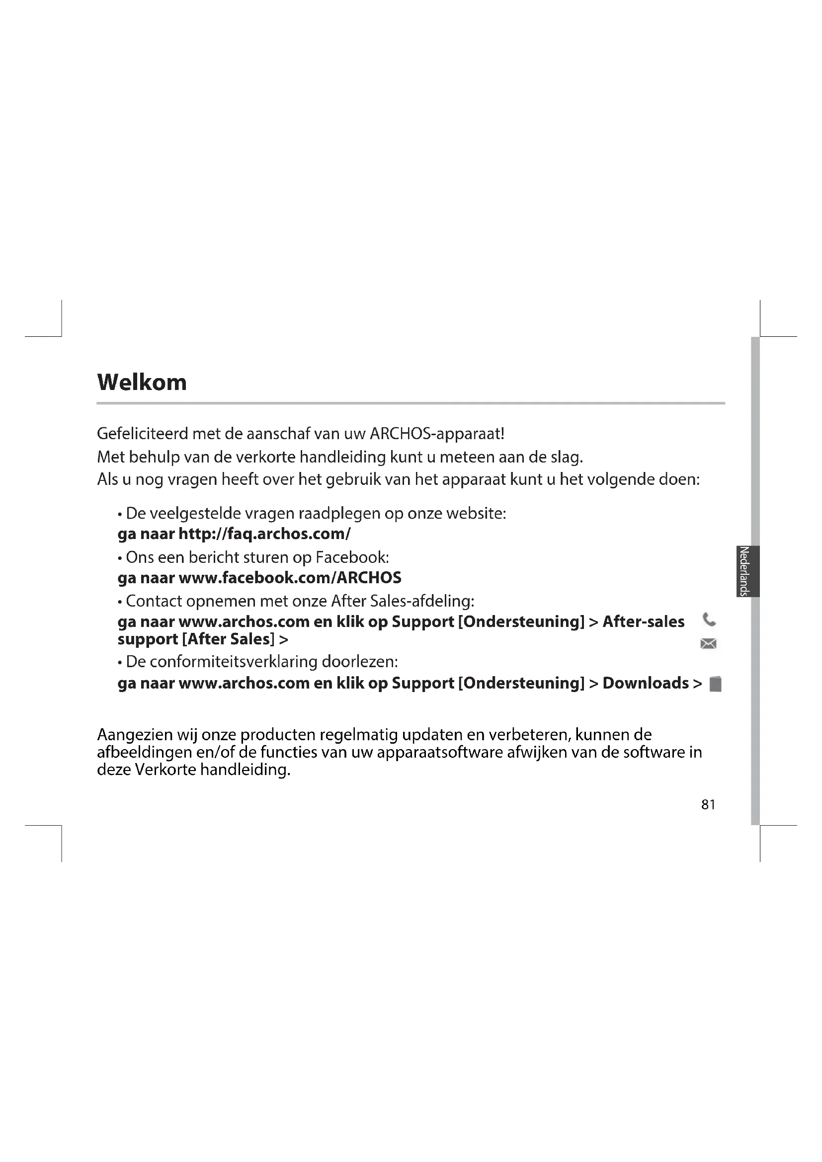 per aggiungere nuovi parametri e inserire i parametri di connessione esatti forniti dall’operatore 3G. Risoluzione dei problemi81 Nederlands Gefeliciteerd met de aanschaf van uw ARCHOS-apparaat! Met behulp van de verkorte handleiding kunt u meteen aan de slag. Als u nog vragen heeft over het gebruik van het apparaat kunt u het volgende doen: