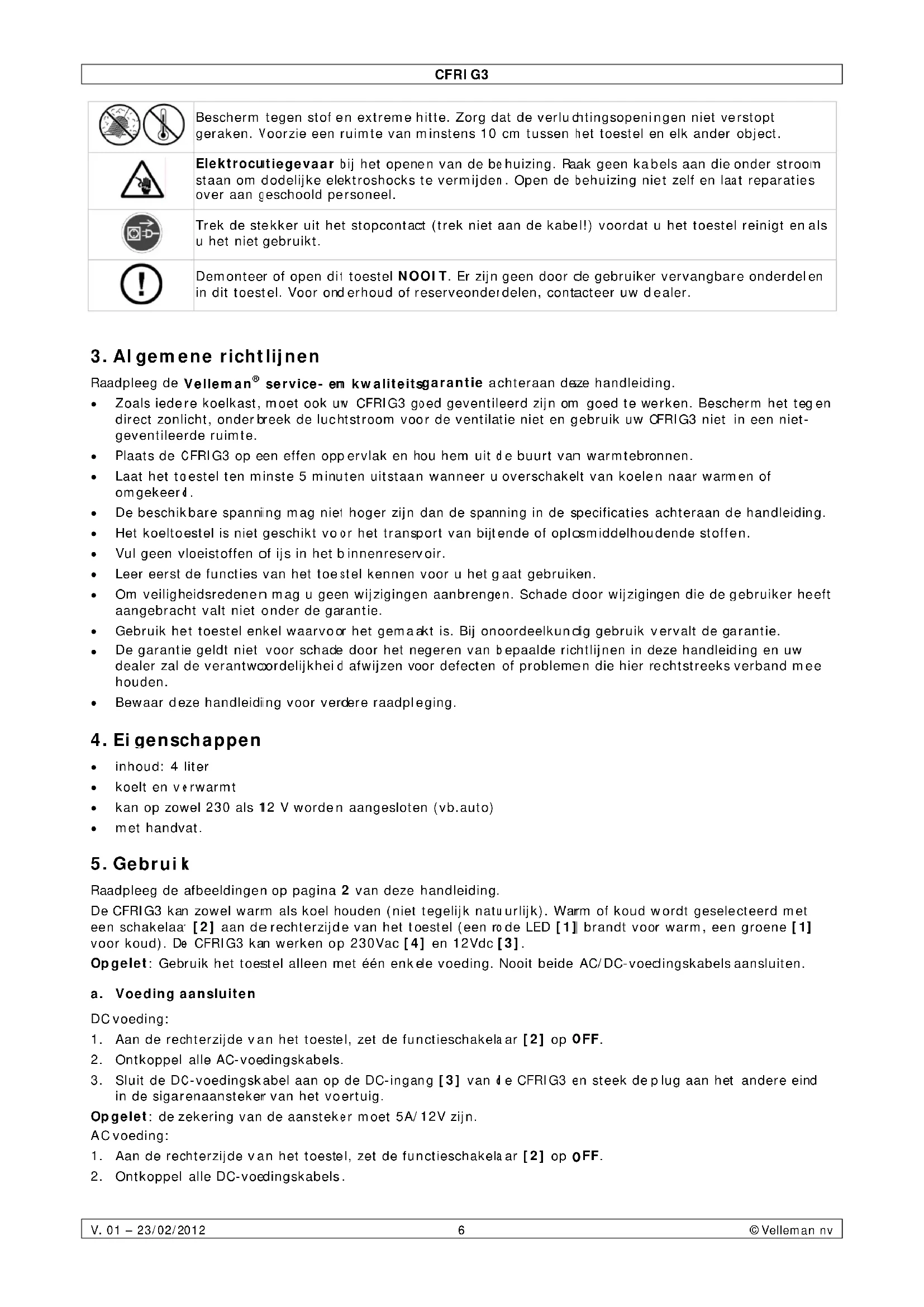 De CFRIG3 kan zowel warm als koel houden (niet tegelijk natuurlijk). Warm of koud wordt geselecteerd met een schakelaa [2] aan de rechterzijde van het toestel (een rode LED [1] brandt voor warm, een groene [1] voor koud). De CFRIG3 kan werkken op 230Vac [4] en 12Vdc [3].