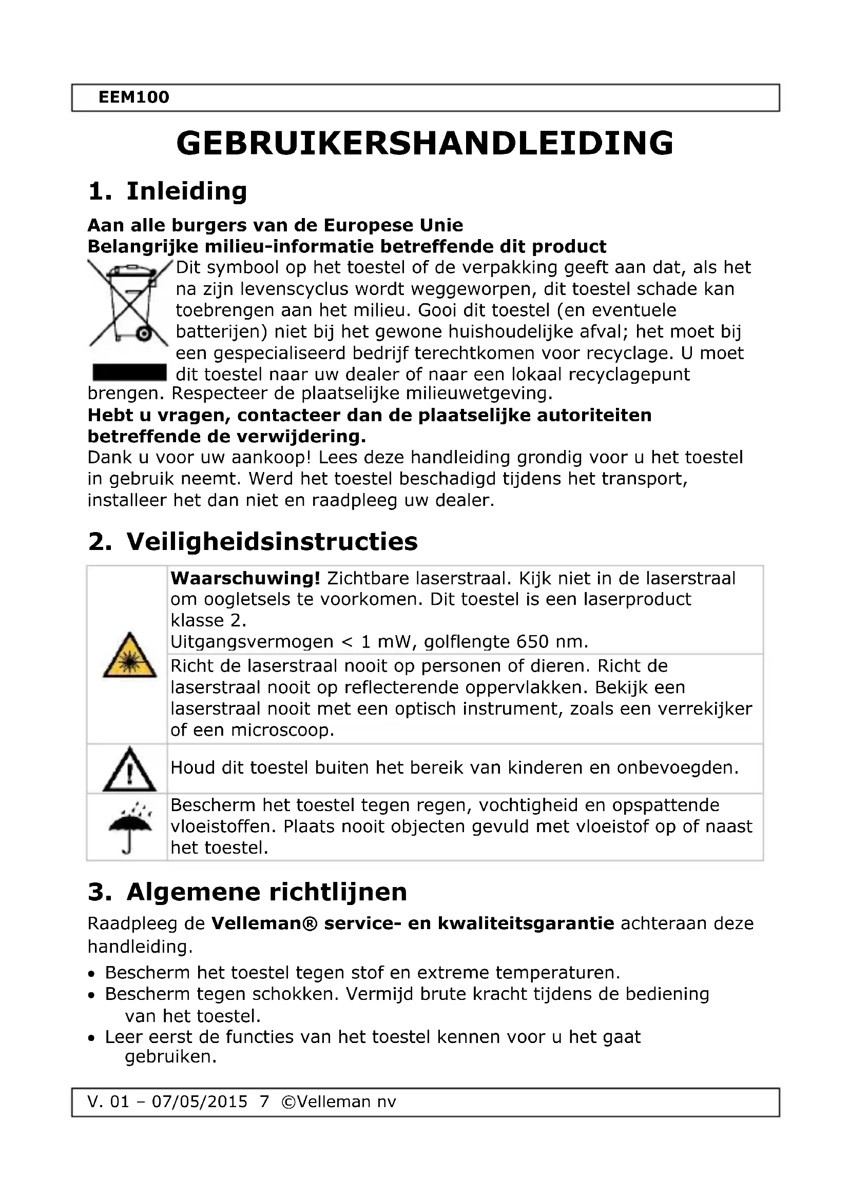 Gebruik dit toestel enkel met originele accessoires. Velleman nv is nicht aansprakelijk voor schade of kwetsuren bij (verkeerd) gebruik van dit toestel. Voor meer informatie over dit product en de LASTe versie van deze handleiding, zie www.velleman.eu. De informatie in deze handleiding kan te allenijdweorden gewijzigd zonder voorafgaande kennisgeving.