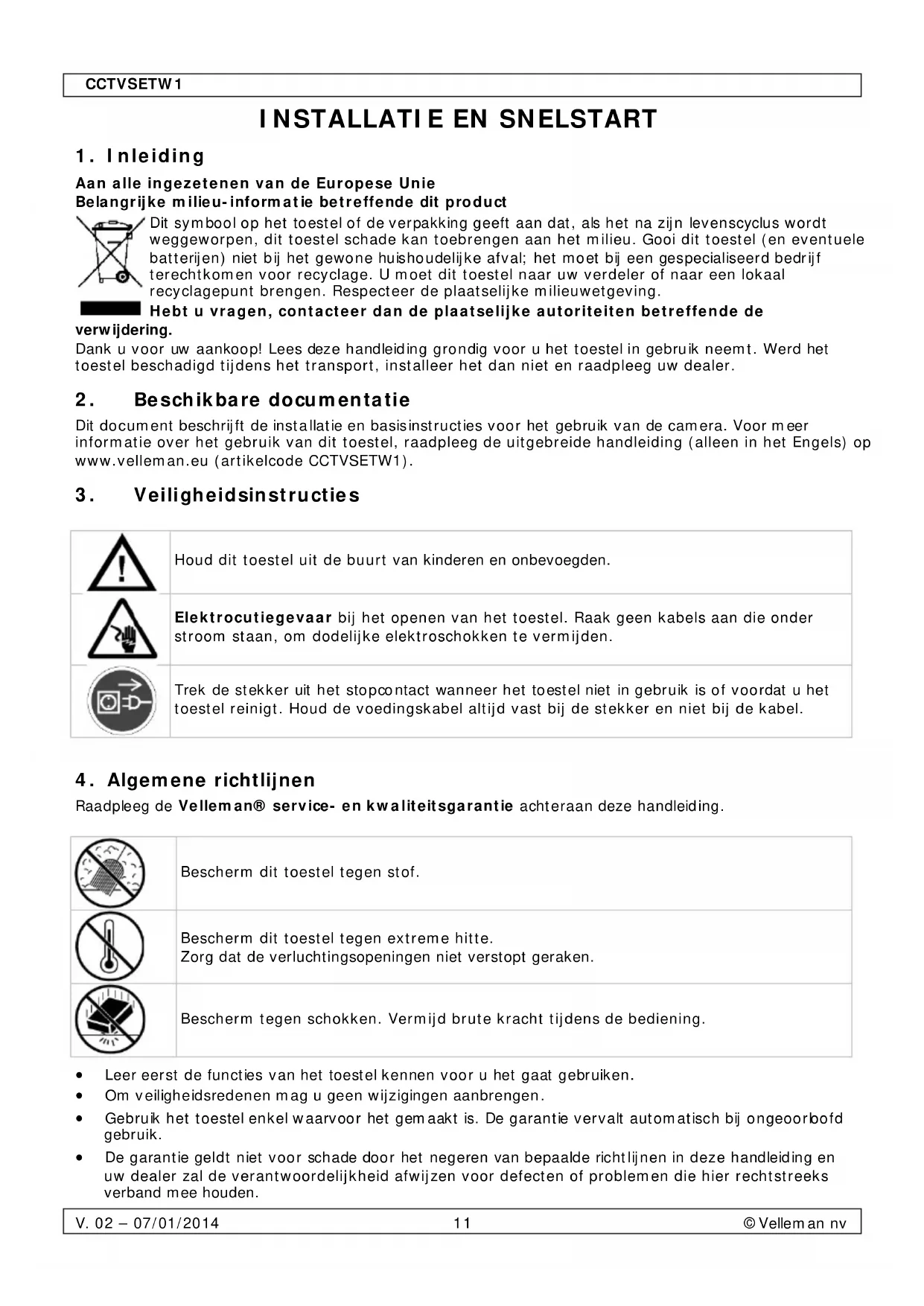 Dit document beschrijft de installatie en basisinstructies voor het gebruik van de camera. Voor meer informatie over het gebruik van dit toestel, raadpleeg de uitgebreide handleiding (alleen in het Engels) op www.velleman.eu (artikelcode CCTVSETW1).