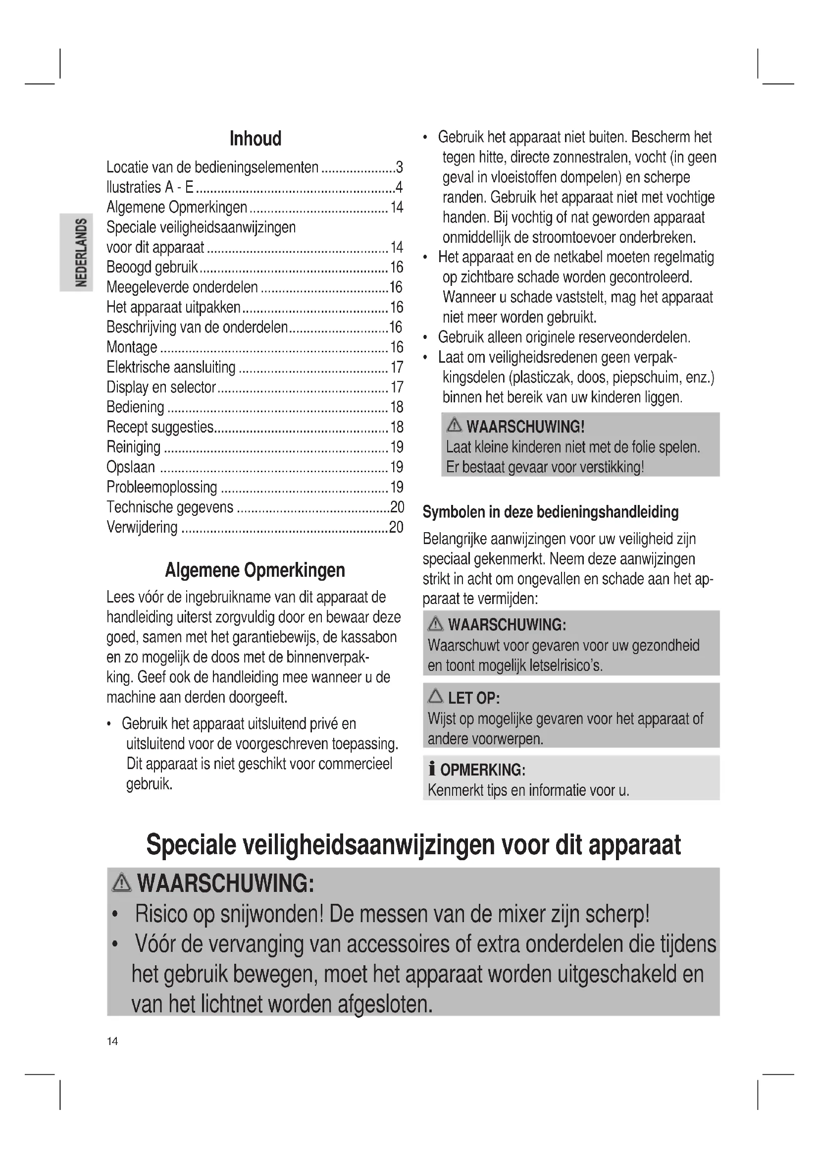 - Laatomveiligheidsredenengeenverpak- kingsdelen (plasticzak, doos, piepschuim, enz.) binnen het bereik van uw kinderen liggen. WAARSCHUWING! Laat kleine kinderen niet met de folie spelen. Er bestaat gevaar voor verstikking! Symbolen in deze bedieningshandleiding Belangrijkeaanwijzingenvooruwveiligheidzijn speciaalgekenmerkt.Neemdezeaanwijzingen strikt in acht om ongevallen en schade aan het ap- paraattevermijden: WAARSCHUWING: Waarschuwt voor gevaren voor uw gezondheid entoontmogelijkletselrisico’s. LET OP: Wijstopmogelijkegevarenvoorhetapparaatof andere voorwerpen. OPMERKING: Kenmerkt tips en informatie voor u. Speciale veiligheidsaanwijzingen voor dit apparaat WAARSCHUWING: