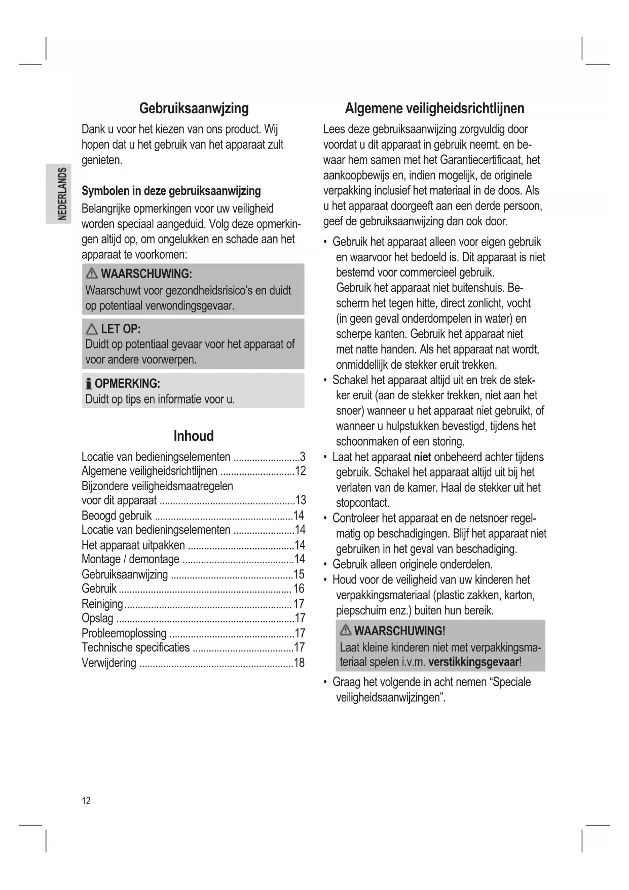 - Laat het apparaat niet onbeheerd achter tijdens gebruik. Schakel het apparaat altijd uit bij het verlaten van de kamer. Haal de stekker uit het stopcontact.