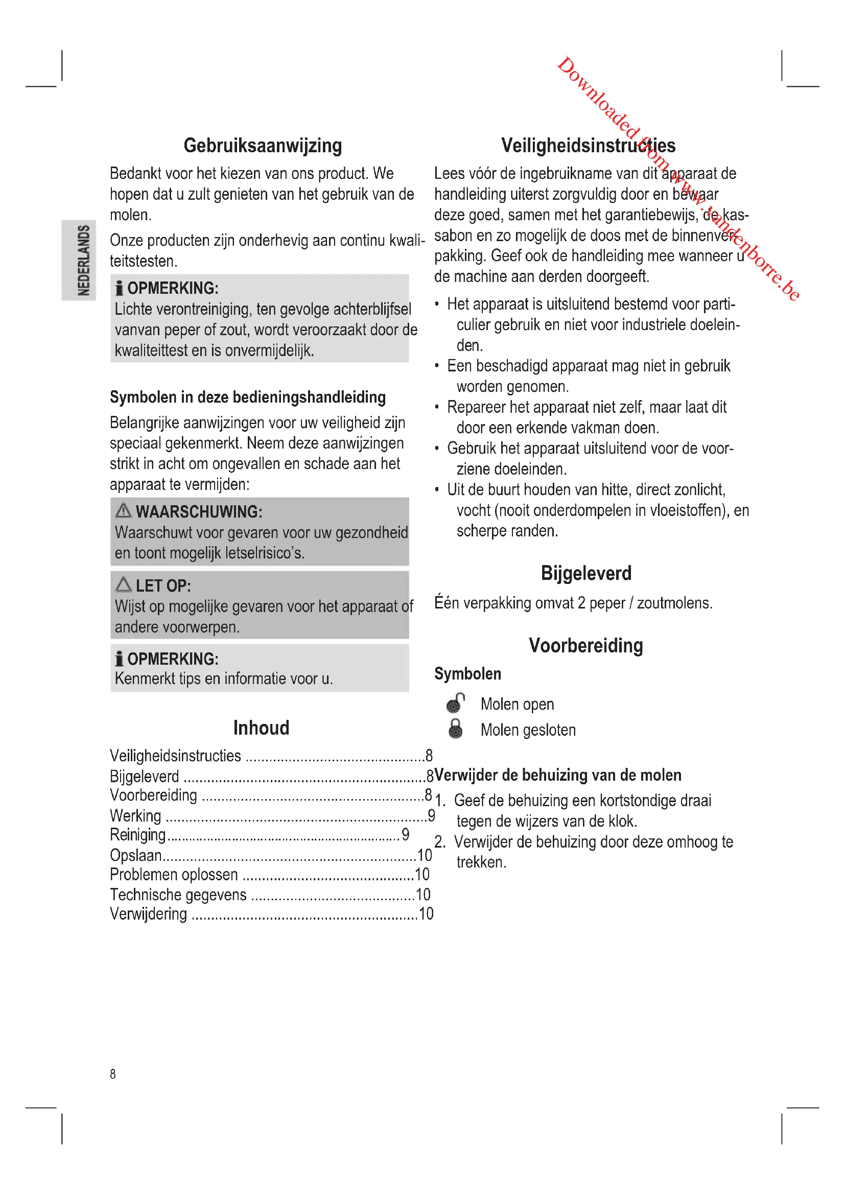 - Uit de buurt houden van hitte, direct zonlicht, vocht (nooit onderdompelen in vloeistoffen), en scherpe randen. Bijgeleverd Één verpakking omvat 2 peper / zoutmolens. Voorbereiding Symbolen Molen open Molen gesloten Verwijder de behuizing van de molen