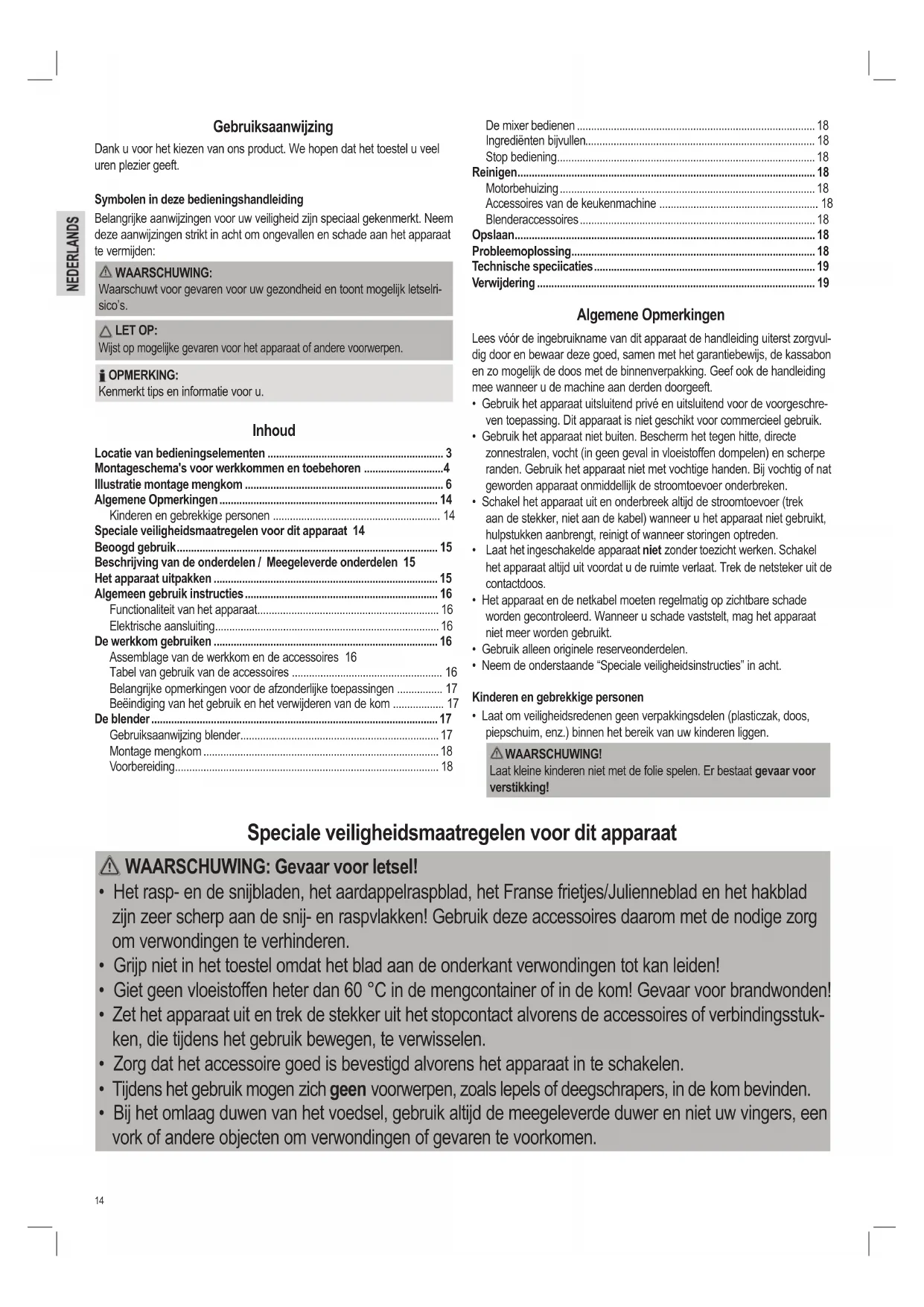 - Mixer om te pureren, kloppen of mixen Het is uitsluitend voor deze doeleinden ontworpen en mag alleen daarvoor gebruikt worden. Het mag alleen gebruikt worden zoals beschreven in de gebruiksaanwijzing. Het toestel mag niet voor commerciële doeleinden worden gebruikt. Elk ander gebruik wordt als oneigenlijk beschouwd en kan beschadiging van het toestel of zelfs persoonlijke verwondingen veroorzaken. De fabrikant kan geen verantwoordelijkheid nemen voor schade als gevolg van oneigenlijk gebruik. Beschrijving van de onderdelen / Meegeleverde onderdelen Overzicht bedieningselementen op pagina 3: 1 Duwer 2 Deksel van de werkkom met voedselopening 3 Kneed-/roeropzetstuk of hakmes 4 Werkkom 5 Geleidepen 6 Aandrijfas 7 Bedieningspaneel 8 Motorbehuizing 9 Garde opzetstuk met gardes 10 Hakblad 11 Franse frietjes/Julienneblad 12 Aardappelraspblad 13 Fijn rasp/snijblad 14 Grof rasp/snijblad 15 Citrusperskegel 16 Filterzeef 17 Mengbekerdop 18 Mengbekerdeksel met vulopening 19 Mengbeker Niet afgebeeld: Deegschraper Het apparaat uitpakken WAARSCUWING: Gevaar voor letsel! Sommige delen van het accessoire zijn erg scherp!