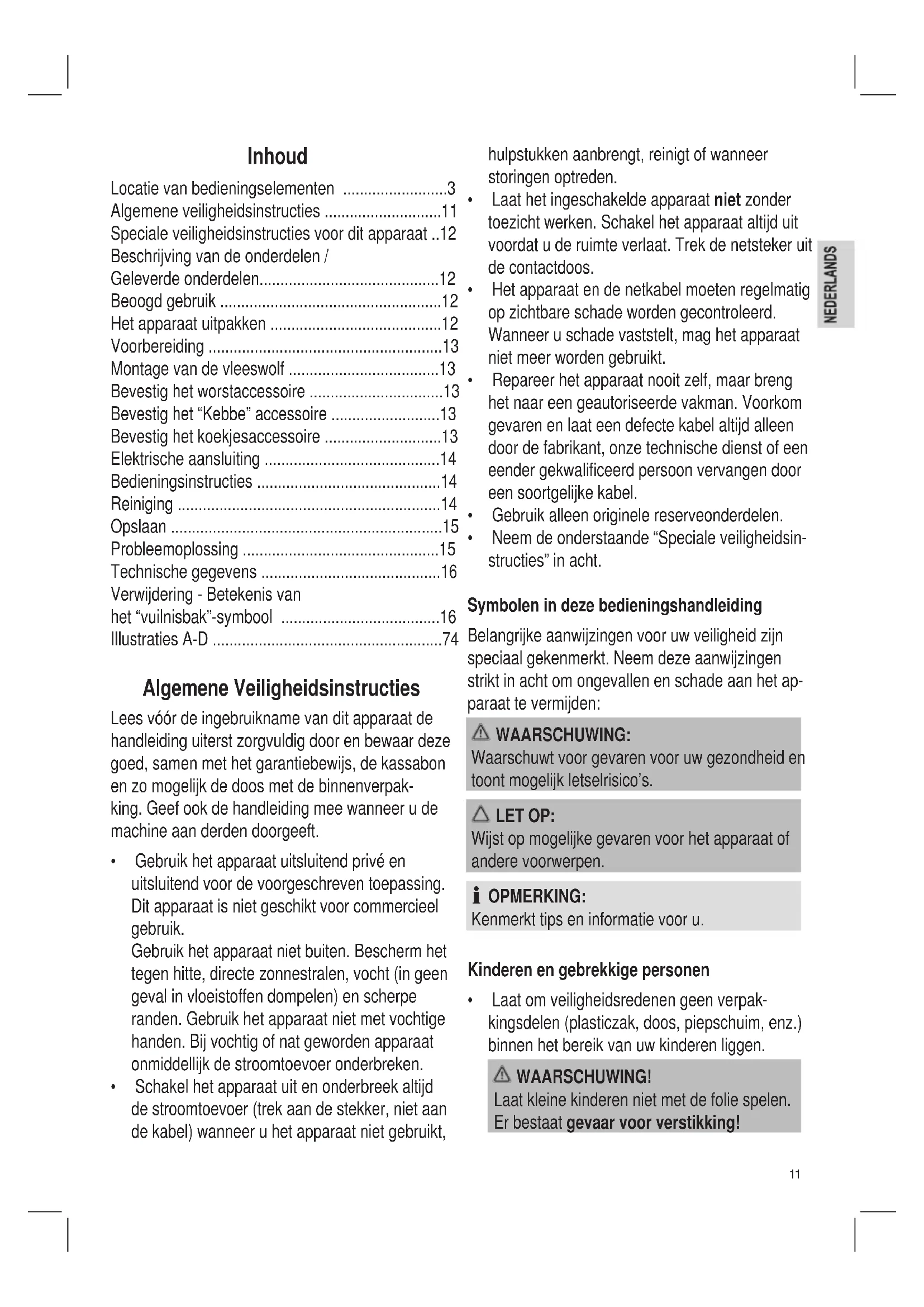 - Bewerkgeenveiligheidsschakelaars. Beschrijving van de onderdelen / Geleverde onderdelen 1 Vulschaal 2 Motor 3 Schakelaar / /R (aan/uit/achteruit) 4 Schroef 5 Spiraalbehuizing 6 Duwstaaf Illustraties A tot D op de laatste pagina: 7 Spiraal 8 Mes 9 3 Zeven (fijn, medium, grof) 10 Vergrendelring 11 Worstaccessoire 12 2-delig hulpstuk “Kebbe” 13 2-delig koekjesaccessoire 14 Rail voor koekjes Beoogd gebruik Dit apparaat kan gebruikt worden voor