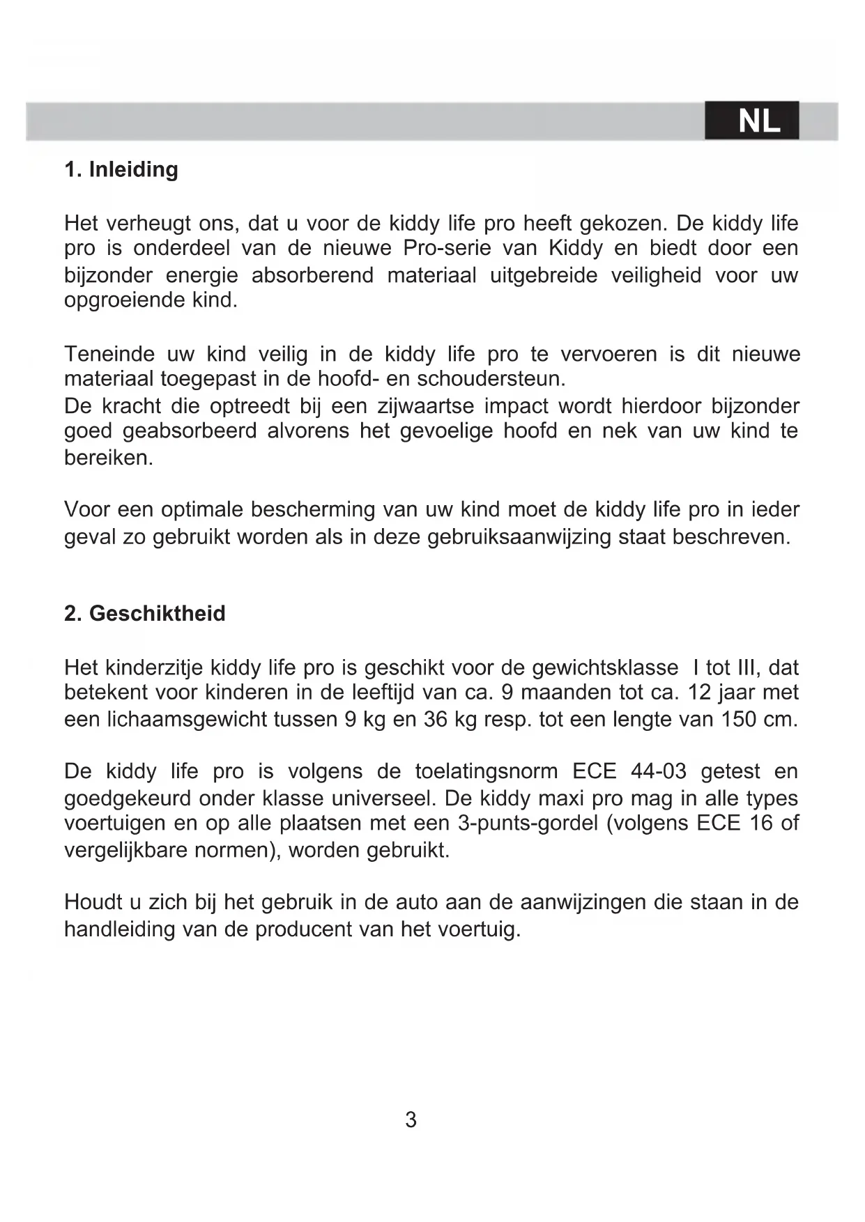 Het verheugt ons, dat u voor de kiddy life pro heeft gekozen. De kiddy life pro is onderdeel van de nieuwe Pro-serie van Kiddy en biedt door een bijzonder energie absorberend materiaal uitgebreide veiligheid voor uw opgroeiende kind. Teneinde uw kind veilig in de kiddy life pro te vervoeren is dit nieuwe materiaal toegepast in de hoofd- en schoudersteun. De kracht die optreedt bij een zijwaartse impact wordt hierdoor bijzonder goed geabsorbeerd alvorens het gevoelige hoofd en nek van uw kind te bereiken. Voor een optimale bescherming van uw kind moet de kiddy life pro in ieder geval zo gebruikt worden als in deze gebruiksaanwijzing staat beschreven.