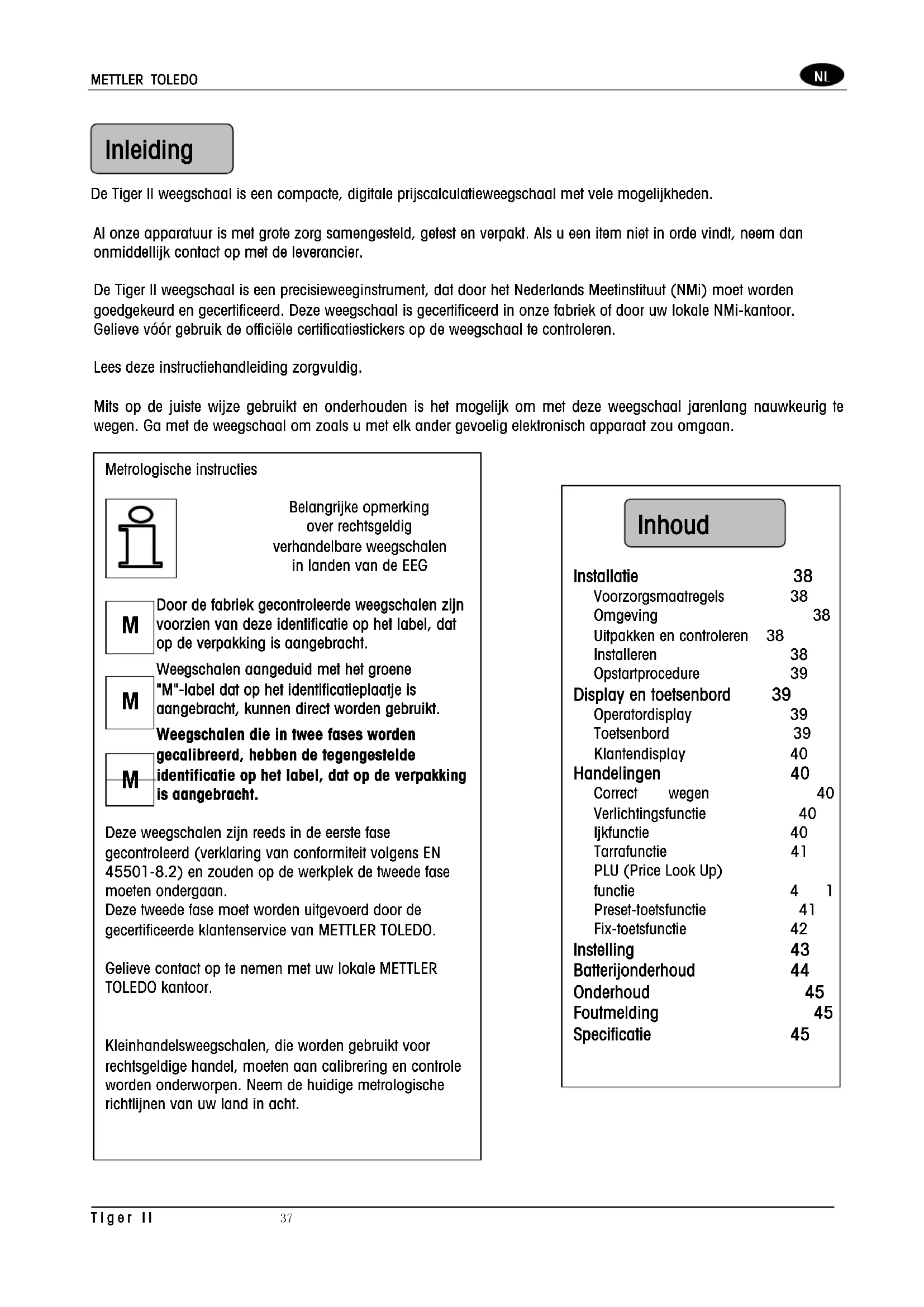 Installatie 38 Voorzorgsmaatregels 38 Omgeving 38 Uitpakken en controleren 38 Installeren 38 Opstartprocedure 39 Display en toetsenbord 39 Operatordisplay 39 Toetsenbord 39 Klantendisplay 40 Handelingen 40 Correct wegen 40 Verlichtingsfunctie 40 Ijkfunctie 40 Tarrafunctie 41 PLU (Price Look Up) functie 41 Preset-toetsfunctie 41 Fix-toetsfunctie 42 Instelling 43 Batterijonderhoud 44 Onderhoud 45 Foutmelding 45 Specificatie 45 InhoudMETTLER TOLEDO 38 Tiger II