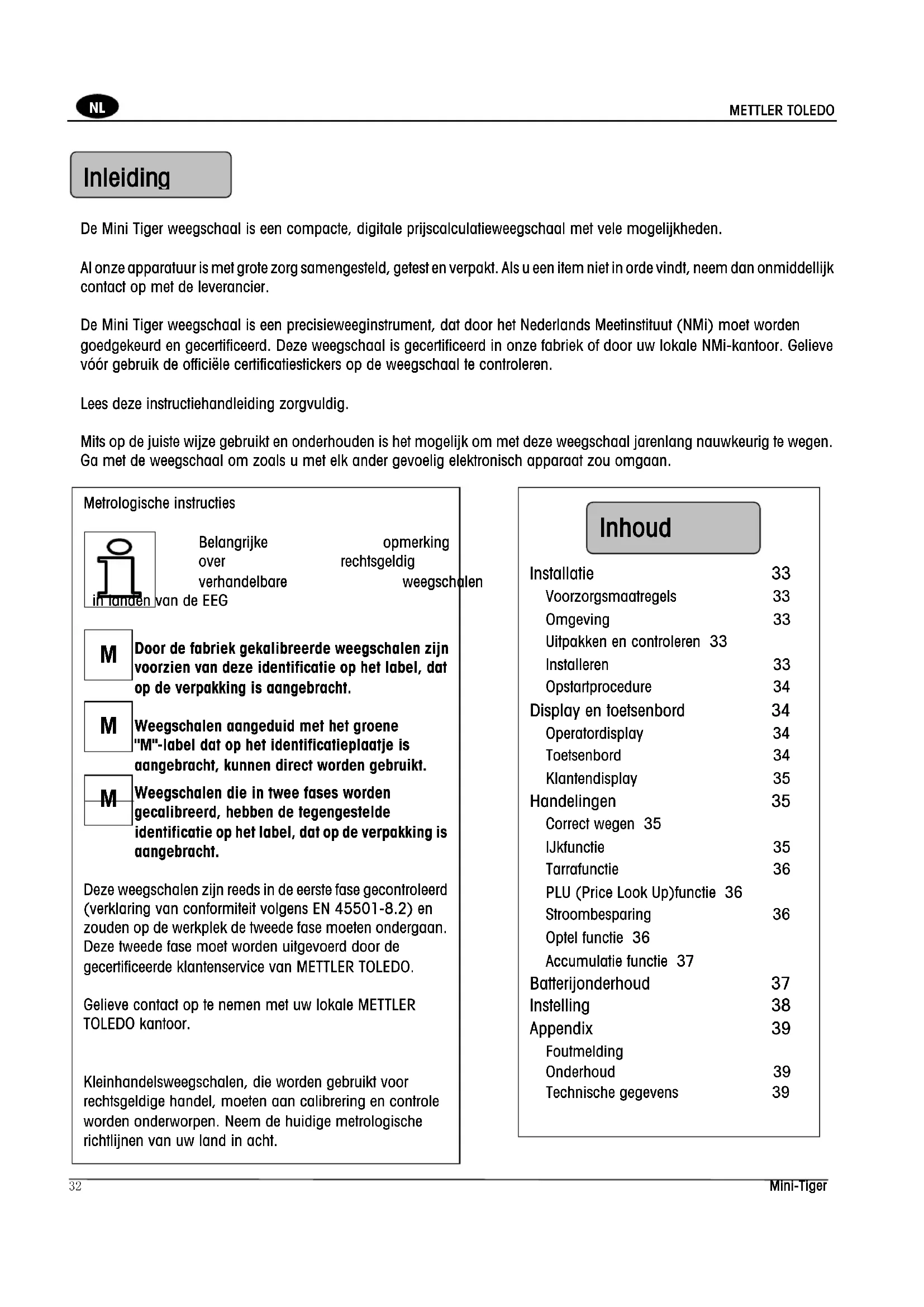 Foutmelding 39 Onderhoud 39 Technische gegevens 39 Inhoud Inleidin gMETTLER TOLEDO Mini Tiger 33