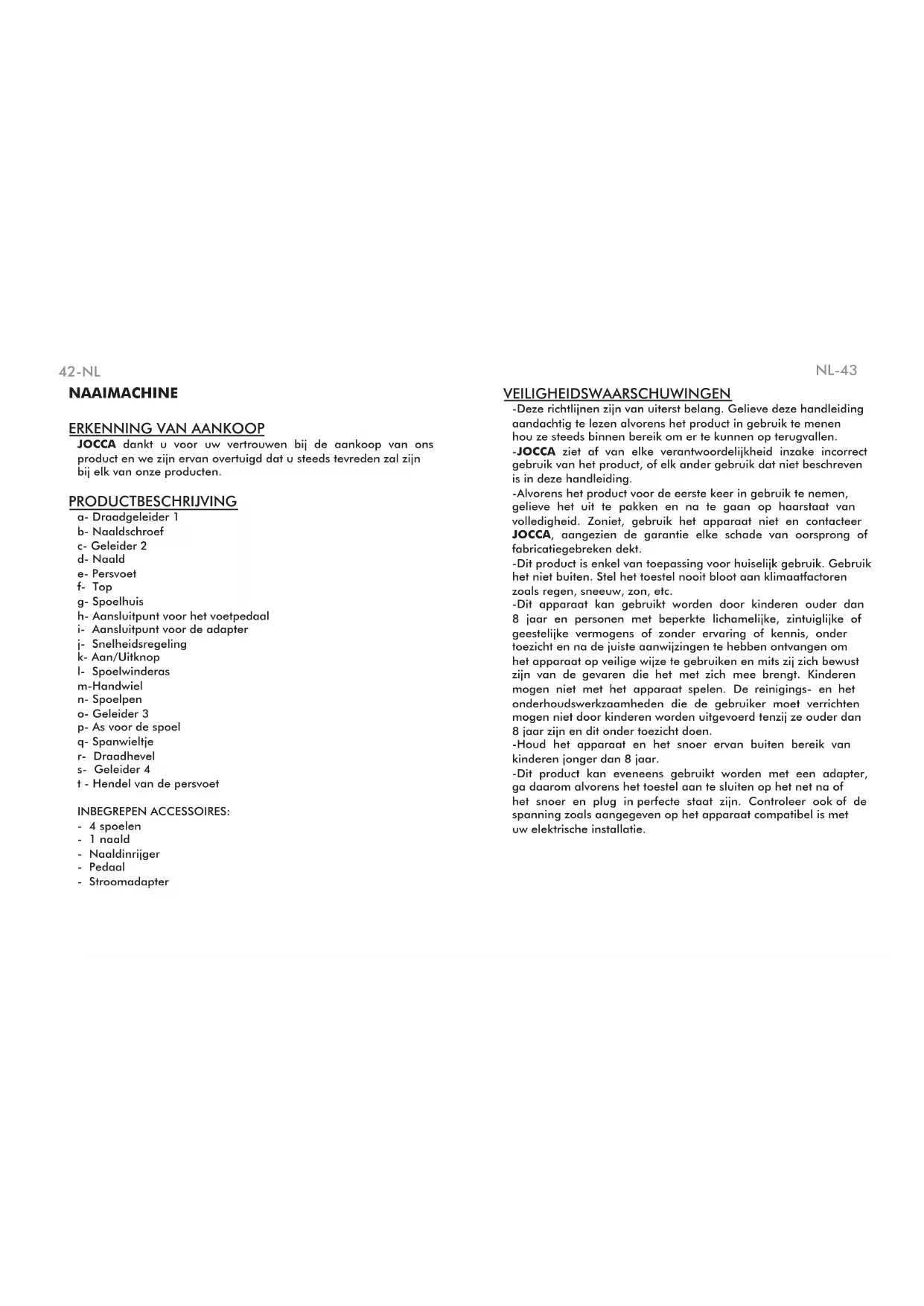 JOCCA dankt u voor uw vertrouwen bij de aankoop van ons product en we zijn ervan overtuigd dat u steeds tevreden zal zijn bij elk van onze producten. PRODUCTBESCHRIJVING a- Draadgeleider 1 b- Naaldschroef c- Geleider 2 d- Naald e- Persvoet f- Top g- Spoelhuis h- Aansluitpunt voor het voetpedaal i- Aansluitpunt voor de adapter j- Snelheidsregeling k- Aan/Uitknop l- Spoelwinderas m-Handwiel n- Spoelpen o- Geleider 3 p- As voor de spoel q- Spanwieltje r- Draadhevel s- Geleider 4 t - Hendel van de persvoet INBEGREPEN ACCESSOIRES: - 4 spoelen - 1 naald - Naaldinrijger - Pedaal - Stroomadapter VEILIGHEIDSWAARSCHUWINGEN -Deze richtlijnen zijn van uiterst belang. Gelieve deze handleiding aandachtig te lezen alvorens het product in gebruik te menen hou ze steeds binnen bereik om er te kunnen op terugvallen. -JOCCA ziet af van elke verantwoordelijkheid inzake incorrect gebruik van het product, of elk ander gebruik dat niet beschreven is in deze handleiding. -Alvorens het product voor de eerste keer in gebruik te nemen, gelieve het uit te pakken en na te gaan op haarstaat van volledigheid. Zoniet, gebruik het apparaat niet en contacteer JOCCA, aangezien de garantie elke schade van oorsprong of fabricatiegebreken dekt. -Dit product is enkel van toepassing voor huiselijk gebruik. Gebruik het niet buiten. Stel het toestel nooit bloot aan klimaatfactoren zoals regen, sneeuw, zon, etc. -Dit apparaat kan gebruikt worden door kinderen ouder dan 8 jaar en personen met beperkte lichamelijke, zintuiglijke of geestelijke vermogens of zonder ervaring of kennis, onder toezicht en na de juiste aanwijzingen te hebben ontvangen om het apparaat op veilige wijze te gebruiken en mits zij zich bewust zijn van de gevaren die het met zich mee brengt. Kinderen mogen niet met het apparaat spelen. De reinigings- en het onderhoudswerkzaamheden die de gebruiker moet verrichten mogen niet door kinderen worden uitgevoerd tenzij ze ouder dan 8 jaar zijn en dit onder toezicht doen. -Houd het apparaat en het snoer ervan buiten bereik van kinderen jonger dan 8 jaar. -Dit product kan eveneens gebruikt worden met een adapter, ga daarom alvorens het toestel aan te sluiten op het net na of het snoer en plug in perfecte staat zijn. Controleer ook of de spanning zoals aangegeven op het apparaat compatibel is met uw elektrische installatie. 42-NL NL-43-Indien u bemerkt dat de stroomtoevoer of de plug beschadigd zijn, gebruik dan het toestel niet en probeer niet om het snoer persoonlijk te herstellen. Ga meteen naar een geautoriseerde JOCCA technische dienst waar ze de vervanging op gepaste wijze voor u zullen uitvoeren. -Dompel het apparaat of deel ervan niet onder in water of enig andere vloeistof. -Trek niet aan het snoer om het apparaat los te koppelen van het hoofdstroomnet, maar doe dit steeds via de plug. -Indien uw toestel is gevallen of in water of een andere vloeistof is ondergedompeld, gebruik het dan niet of probeer het niet te herstellen. Breng het naar een JOCCA technische dienst. -Voor uw veiligheid en om het toestel steeds correct te laten werken, gebruik steeds JOCCA vervangingsonderdelen en accessoires -Verplaats het toestel niet wanneer het in gebruik is. -Gebruik het apparaat op een vlak, horizontaal en glad oppervlak. -Dit toestel wordt volledig uitgeschakeld wanneer het wordt losgekoppeld van het stroomnet. -Houd het haar, kleding en andere voorwerpen weg bij het apparaat terwijl het in werking is. -Wij raden het gebruik van adapters, stekkers en/of verlengsnoeren af. Als die elementen noodzakelijk zouden zijn, gebruik dan alleen enkelvoudige of meervoudige adapters en verlengsnoeren die voldoen aan de geldige veiligheidsnormen en zorg ervoor dat de op de adapter en/of de verlengsnoer aangeduide vermogenslimiet niet wordt overschreden. WAARSCHUWING: Schakel de machine uit en koppel de adapter los in de volgende gevallen: -Bij het uitvoeren van een activiteit zoals de naald inrijgen, het vervangen van de naald of het verwisselen van de bobijn. -Bij het vervangen van onderdelen of tijdens het naaien. -Wanneer u stopt het toestel te gebruiken. -Gedurende een stroomonderbreking. -Tijdens het gebruik van de machine, let aandachtig op de naald en het evenwichtswiel, druk nooit op de bobijn of naald. WAARSCHUWINGEN OVER BATTERIJEN: -Verwijder de batterij uit het vakje als u het apparaat gedurende lange tijd niet gaat gebruiken. -Vergeet niet dat de batterijen moeten worden weggegooid in speciaal daarvoor bestemde batterijbakken. -Wilt u het apparaat van de hand doen, vergeet dan niet de batterijen uit het apparaat te verwijderen. -Als de batterij een lek heeft, raak hem dan nooit direct met de handen aan. -Verwissel de batterij wanneer hij leeg is. -Er mogen alleen batterijen van hetzelfde model of een gelijkwaardig model als de aanbevolen batterijen worden gebruikt. -De batterij moet in overeenstemming met de juiste aangeduide polariteit worden aangebracht. -Plaats het batterijvakje nooit in de buurt van vuur of een warmtebron. -Gooi de batterijen niet in het vuur en plaats de besturingseenheid evenmin in de zon. -Meng nieuwe batterijen niet met gebruikte of oude batterijen. GEBRUIKSAANWIJZINGEN