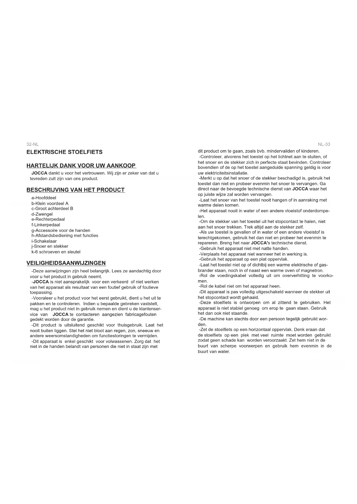 -Versichern Sie sich, dass der Stecker herausgezogen ist, bevor Sie das Gerät reinigen. -Verwenden Sie keine Scheuerreinigungsmittel oder Produkte,NL-33 dit product om te gaan, zoals bvb. mindervaliden of kinderen. -Controleer, alvorens het toestel op het lichtnet aan te sluiten, of het snoer en de stekker zich in perfecte staat bevinden. Controleer bovendien of de op het toestel aangeduide spanning geldig is voor uw elektriciteitsinstallatie. -Merkt u op dat het snoer of de stekker beschadigd is, gebruik het toestel dan niet en probeer evenmin het snoer te vervangen. Ga direct naar de bevoegde technische dienst van JOCCA waar het op juiste wijze zal worden vervangen. -Laat het snoer van het toestel nooit hangen of in aanraking met warme delen komen. -Het apparaat nooit in water of een andere vloeistof onderdompe- len. -Om de stekker van het toestel uit het stopcontact te halen, niet aan het snoer trekken. Trek altijd aan de stekker zelf. -Als uw toestel is gevallen of in water of een andere vloeistof is terechtgekomen, gebruik het dan niet en probeer het evenmin te repareren. Breng het naar JOCCA's technische dienst. -Gebruik het apparaat niet met natte handen. -Verplaats het apparaat niet wanneer het in werking is. -Gebruik het apparaat op een plat oppervlak. -Laat het toestel niet op of dichtbij een warme elektrische of gas- brander staan, noch in of naast een warme oven of magnetron. -Rol de voedingskabel volledig uit om oververhitting te voorko- men. -Rol de kabel niet om het apparaat heen. -Dit apparaat is pas volledig uitgeschakeld wanneer de stekker uit het stopcontact wordt gehaald. -Deze stoelfiets is ontworpen om al zittend te gebruiken. Het apparaat is niet stabiel genoeg om erop te gaan staan. Gebruik het dan ook niet staande. -De machine kan slechts door een persoon tegelijk gebruikt wor- den. -Zet de stoelfiets op een horizontaal oppervlak. Denk eraan dat de stoelfiets op een plek met veel ruimte moet worden gebruikt zodat geen schade kan worden veroorzaakt. Zet hem niet in de buurt van scherpe voorwerpen en gebruik hem evenmin in de buurt van water. 32-NL ELEKTRISCHE STOELFIETS