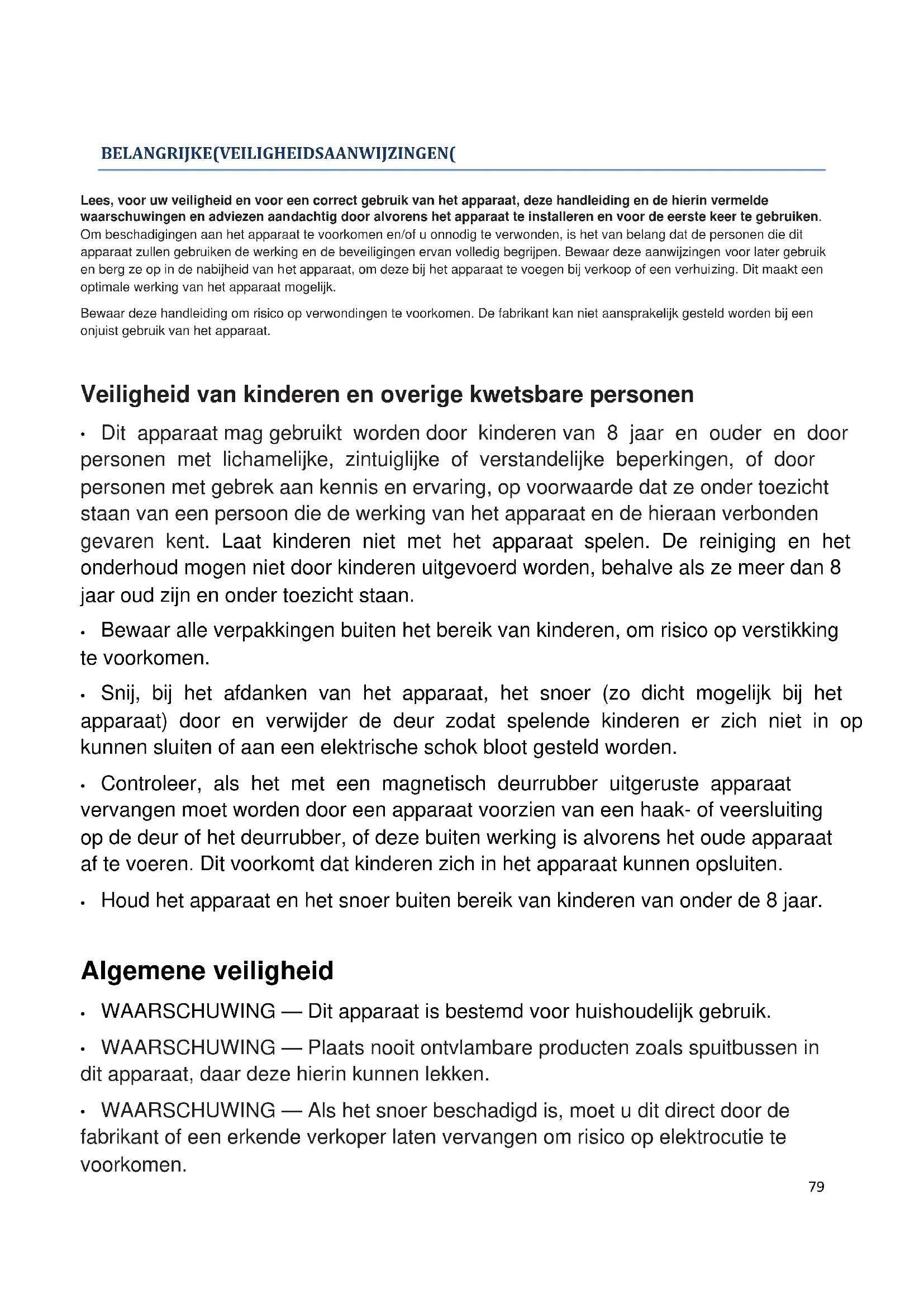 - Snij, bij het afdanken van het apparaat, het snoer (zo zich möglichk bij het apparaat) door en verwijder de deur zoday spelende kinderen er zich nicht in op konnen sluiten of aan een elektrische schokbloot gesteld worden.