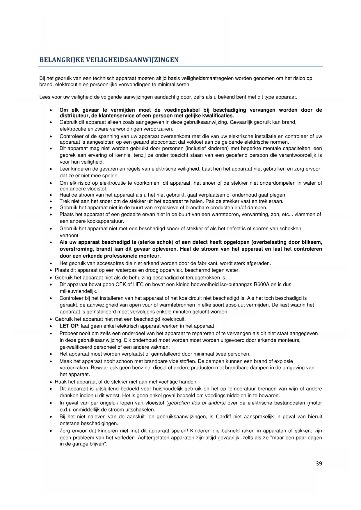 - Dit apparaat is uitsluitend bedoeld voor huishoudelijk gebruik en het op temperatuur brengen van wijn of andere dranken indien u dit wenst. Het is geen enkel geval bedoeld om voedingsmiddelen in te bewaren.