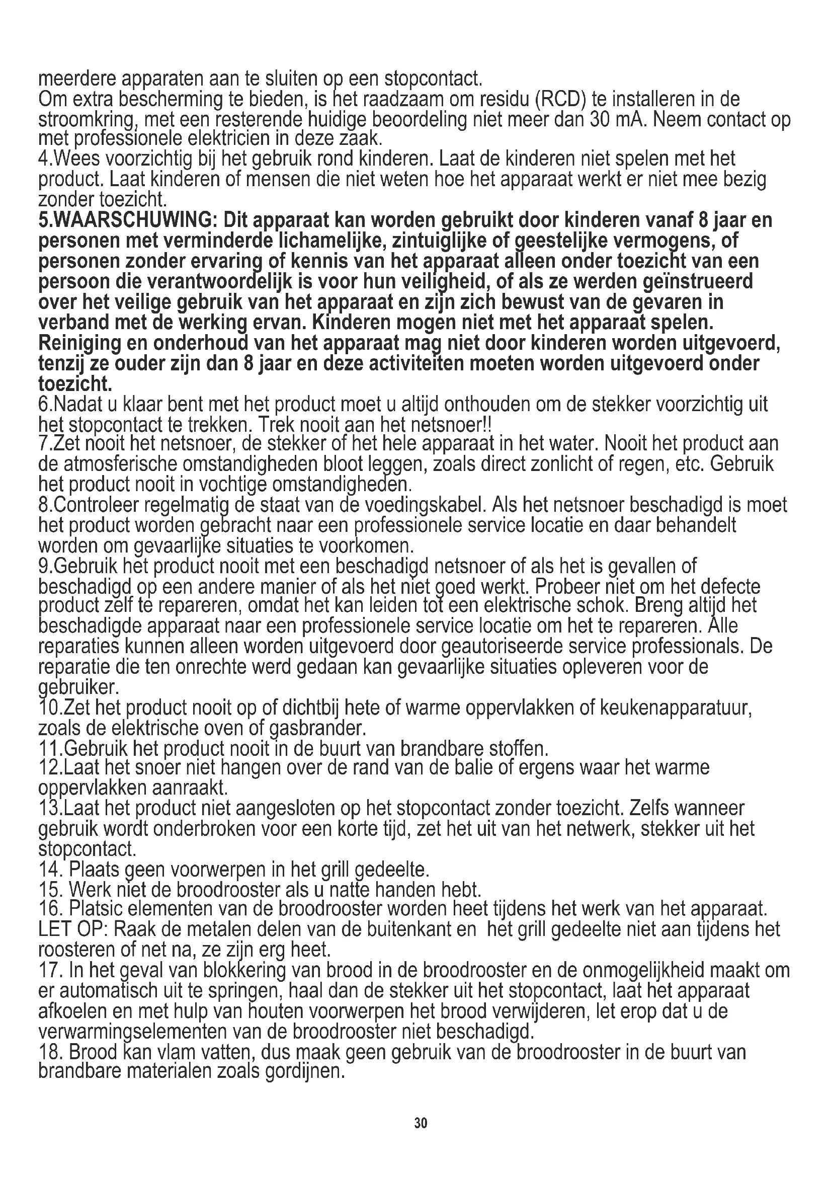 VEILIGHEID CONDITIES. BELANGRIJKE INSTRUCTIES VOOR DE VEILIGHEID VAN GEBRUIK. LEES DIT ZORGVULDIG DOOR EN BEWAAR HET VOOR LATER GEBRUIK. De garantievoorwaarden zijn verschillend, als het apparaat wordt gebruikt voor commerciële doeleinden. 1.Voordat u het product gebruikt, lees aandachtig en voldoe altijd aan de volgende instructies. De fabrikant is niet verantwoordelijk voor eventuele schade als gevolg van verkeerd gebruik. 2.Het product is alleen voor binnenshuis gebruik. Gebruik het product niet voor een doel dat niet verenigbaar is met de toepassing ervan. 3.De toepasselijke voltage is 230V, ~50Hz. Om veiligheidsredenen is het niet wenselijk om NEDERLANDS pomůcky odstraňte toasty z komor. Dávejte pozor, aby nedošlo k poškození topných částí toustovače.