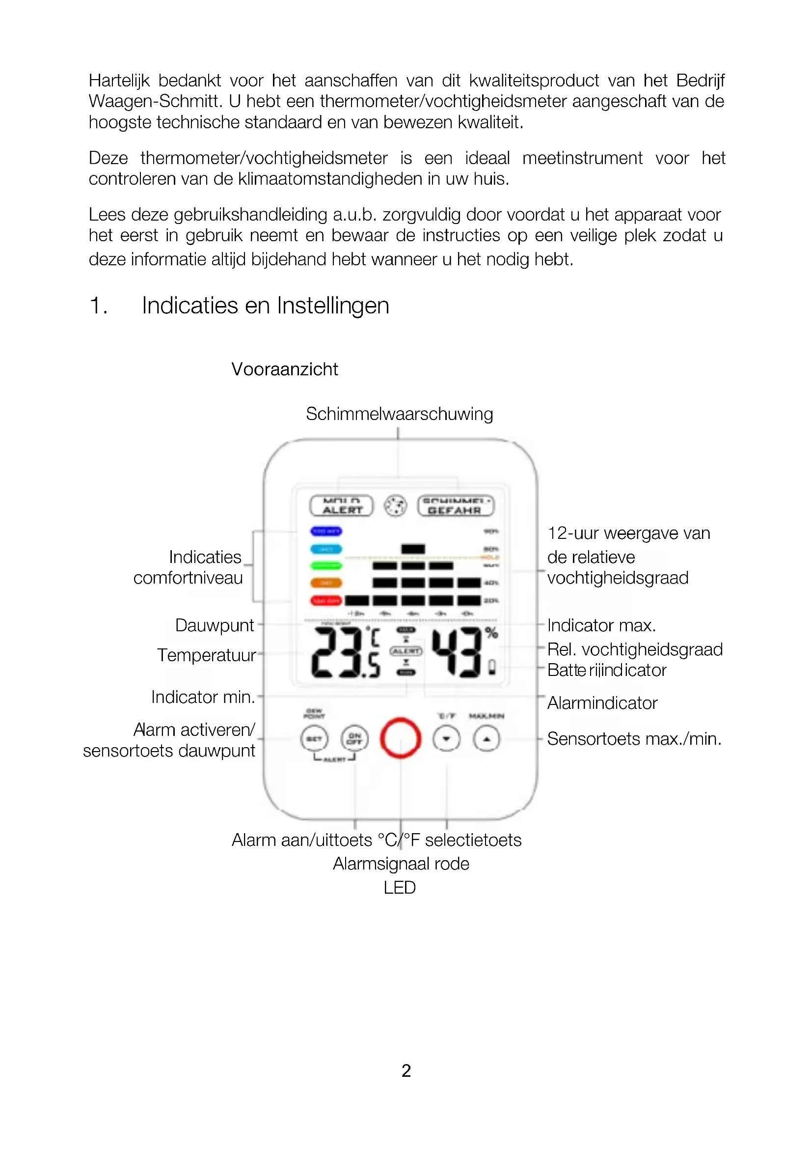 Hartelijk bedankt voor het aanschaffen van dit kwaliteitsproduct van het Bedrijf Waagen-Schmitt. U hebt een thermometer/vochtigheidsmeter aangeschaft van de hoogste technische standaard en van bewezen kwaliteit. Deze thermometer/vochtigheidsmeter is een ideaal meetinstrument voor het controleren van de klimaatomstandigheden in uw huis. Lees deze gebruikshandleiding a.u.b. zorgvuldig door voordat u het apparaat voor het eerst in gebruik neemt en bewaar de instructies op een veilige plek zodat u deze informatie altijd bijdehand hebt wanneer u het nodig hebt.