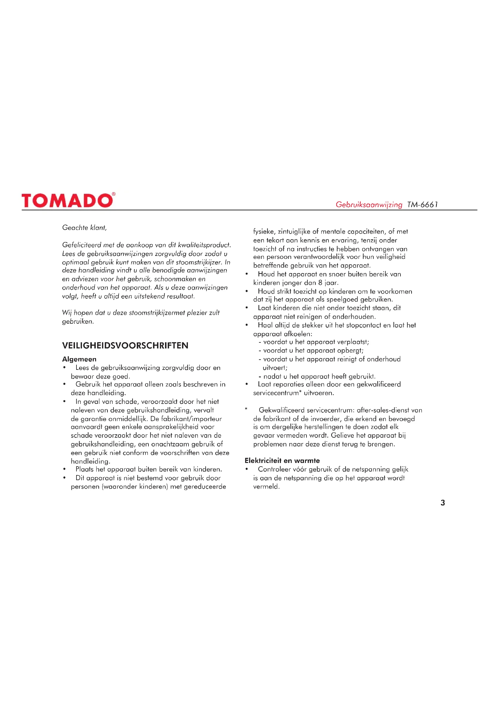 - Droognameteendrogedoek. OPbERGEN Zetdestoomregelaaropstand‘0’.Leeghet waterreservoir.Zethetstrijkijzeropzijnachterkantop eendrogeplaats. TECHNISCHE GEGEVENS TM-6661 Vermogen: 2300W Voltage: 230V–50Hz Gebruiksaanwijzing TM-666111 Wijfeliciterenumetdeaanschafvaneenapparaatuithet TOMADO-assortiment. Garantiebepalingen