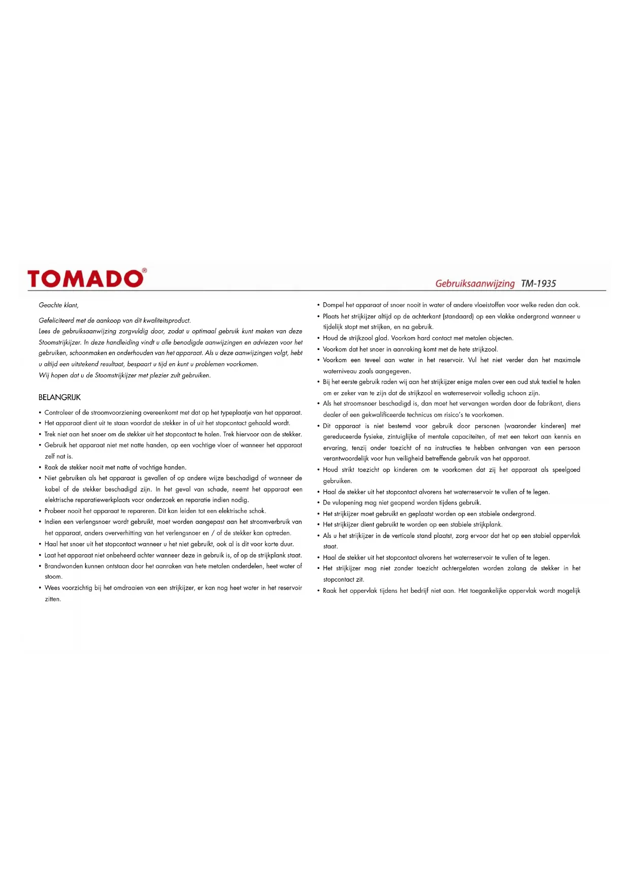GEBRUIKSAANWIJZING TM1935 Tomado
