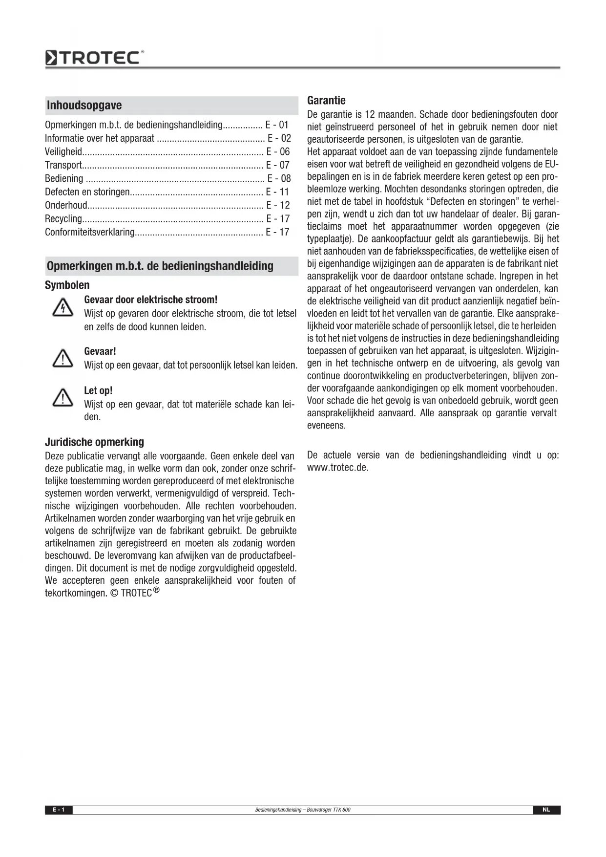 IEC 62233:2005 Il contrassegno si trova sul contrassegno di fabbrica dell'appa- recchio. Produttore: Trotec GmbH & Co. KG Grebbener Straße 7 D-52525 Heinsberg Telefono: +49 2452 962-400 Fax: +49 2452 962-200 E-mail: info@trotec.de Heinsberg, il 23.11.2009 Direttore: Detlef von der Lieck Smaltimento Dichiarazione di conformitàE - 1 Bedieningshandleiding – Bouwdroger TTK 800 NL Symbolen Gevaar door elektrische stroom! Wijst op gevaren door elektrische stroom, die tot letsel en zelfs de dood kunnen leiden. Gevaar! Wijst op een gevaar, dat tot persoonlijk letsel kan leiden. Let op! Wijst op een gevaar, dat tot materiële schade kan lei- den. Juridische opmerking Deze publicatie vervangt alle voorgaande. Geen enkele deel van deze publicatie mag, in welke vorm dan ook, zonder onze schrif- telijke toestemming worden gereproduceerd of met elektronische systemen worden verwerkt, vermenigvuldigd of verspreid. Tech- nische wijzigingen voorbehouden. Alle rechten voorbehouden. Artikelnamen worden zonder waarborging van het vrije gebruik en volgens de schrijfwijze van de fabrikant gebruikt. De gebruikte artikelnamen zijn geregistreerd en moeten als zodanig worden beschouwd. De leveromvang kan afwijken van de productafbeel- dingen. Dit document is met de nodige zorgvuldigheid opgesteld. We accepteren geen enkele aansprakelijkheid voor fouten of tekortkomingen. © TROTEC