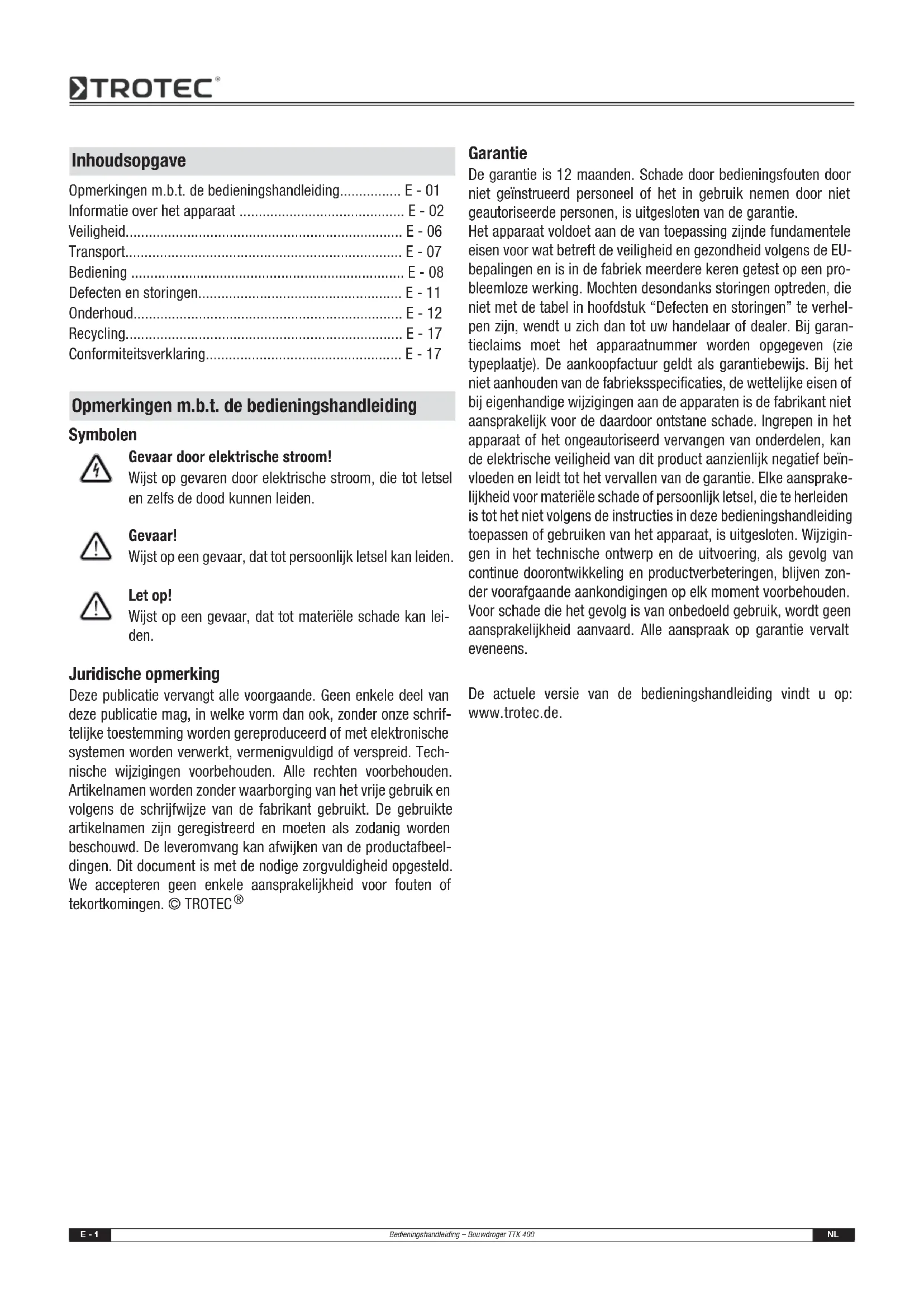 IEC 62233:2005 Il contrassegno si trova sul contrassegno di fabbrica dell'appa- recchio. Produttore: Trotec GmbH & Co. KG Grebbener Straße 7 D-52525 Heinsberg Telefono: +49 2452 962-400 Fax: +49 2452 962-200 E-mail: info@trotec.de Heinsberg, il 07.04.2010 Direttore: Detlef von der Lieck Smaltimento Dichiarazione di conformitàE - 1 Bedieningshandleiding – Bouwdroger TTK 400 NL Symbolen Gevaar door elektrische stroom! Wijst op gevaren door elektrische stroom, die tot letsel en zelfs de dood kunnen leiden. Gevaar! Wijst op een gevaar, dat tot persoonlijk letsel kan leiden. Let op! Wijst op een gevaar, dat tot materiële schade kan lei- den. Juridische opmerking Deze publicatie vervangt alle voorgaande. Geen enkele deel van deze publicatie mag, in welke vorm dan ook, zonder onze schrif- telijke toestemming worden gereproduceerd of met elektronische systemen worden verwerkt, vermenigvuldigd of verspreid. Tech- nische wijzigingen voorbehouden. Alle rechten voorbehouden. Artikelnamen worden zonder waarborging van het vrije gebruik en volgens de schrijfwijze van de fabrikant gebruikt. De gebruikte artikelnamen zijn geregistreerd en moeten als zodanig worden beschouwd. De leveromvang kan afwijken van de productafbeel- dingen. Dit document is met de nodige zorgvuldigheid opgesteld. We accepteren geen enkele aansprakelijkheid voor fouten of tekortkomingen. © TROTEC