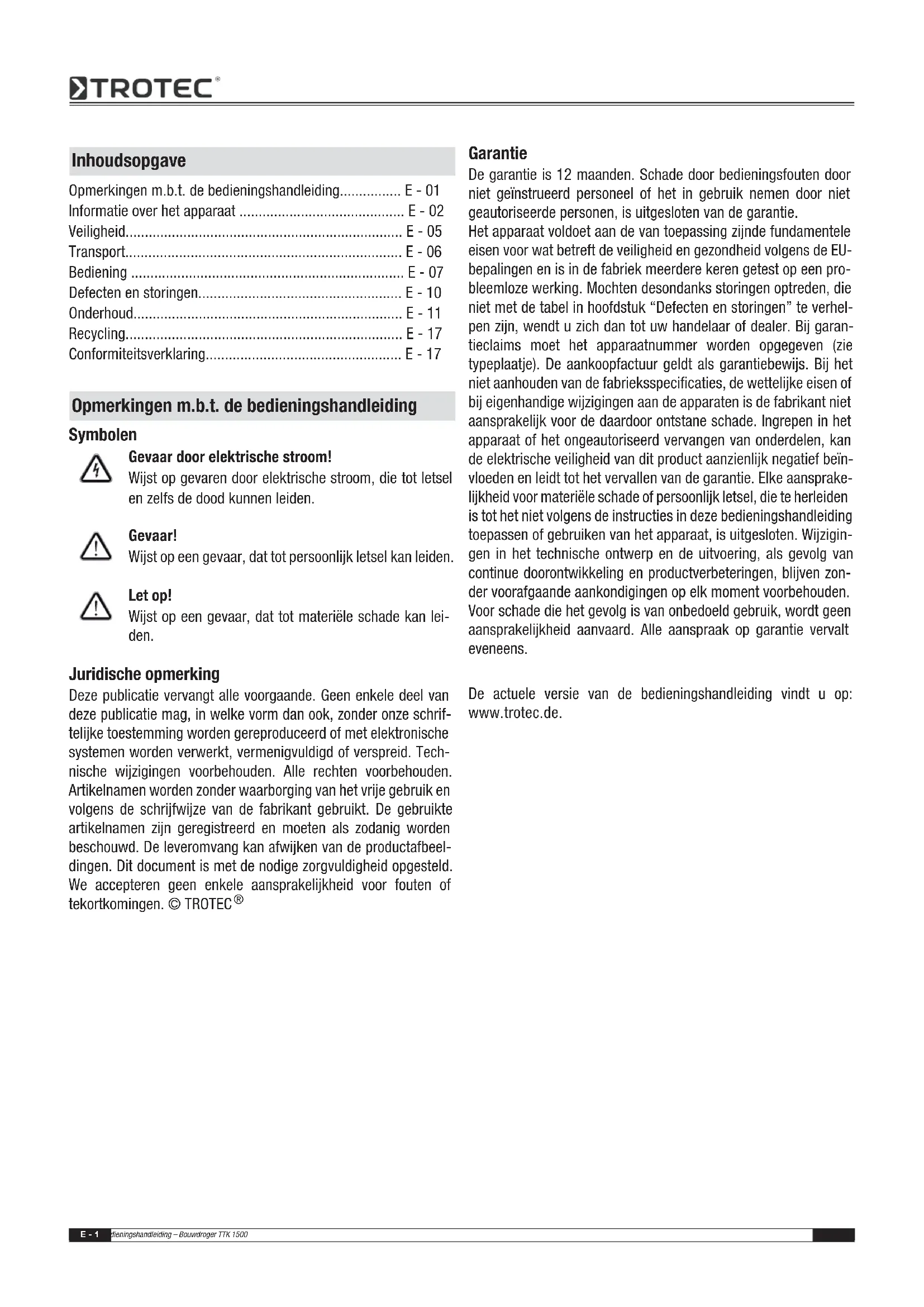 IEC 62233:2005 Il contrassegno si trova sul contrassegno di fabbrica dell'appa- recchio. Produttore: Trotec GmbH & Co. KG Grebbener Straße 7 D-52525 Heinsberg Telefono: +49 2452 962-400 Fax: +49 2452 962-200 E-mail: info@trotec.de Heinsberg, il 30.10.2009 Direttore: Detlef von der Lieck Smaltimento Dichiarazione di conformitàE - 1 Bedieningshandleiding – Bouwdroger TTK 1500 NL Symbolen Gevaar door elektrische stroom! Wijst op gevaren door elektrische stroom, die tot letsel en zelfs de dood kunnen leiden. Gevaar! Wijst op een gevaar, dat tot persoonlijk letsel kan leiden. Let op! Wijst op een gevaar, dat tot materiële schade kan lei- den. Juridische opmerking Deze publicatie vervangt alle voorgaande. Geen enkele deel van deze publicatie mag, in welke vorm dan ook, zonder onze schrif- telijke toestemming worden gereproduceerd of met elektronische systemen worden verwerkt, vermenigvuldigd of verspreid. Tech- nische wijzigingen voorbehouden. Alle rechten voorbehouden. Artikelnamen worden zonder waarborging van het vrije gebruik en volgens de schrijfwijze van de fabrikant gebruikt. De gebruikte artikelnamen zijn geregistreerd en moeten als zodanig worden beschouwd. De leveromvang kan afwijken van de productafbeel- dingen. Dit document is met de nodige zorgvuldigheid opgesteld. We accepteren geen enkele aansprakelijkheid voor fouten of tekortkomingen. © TROTEC