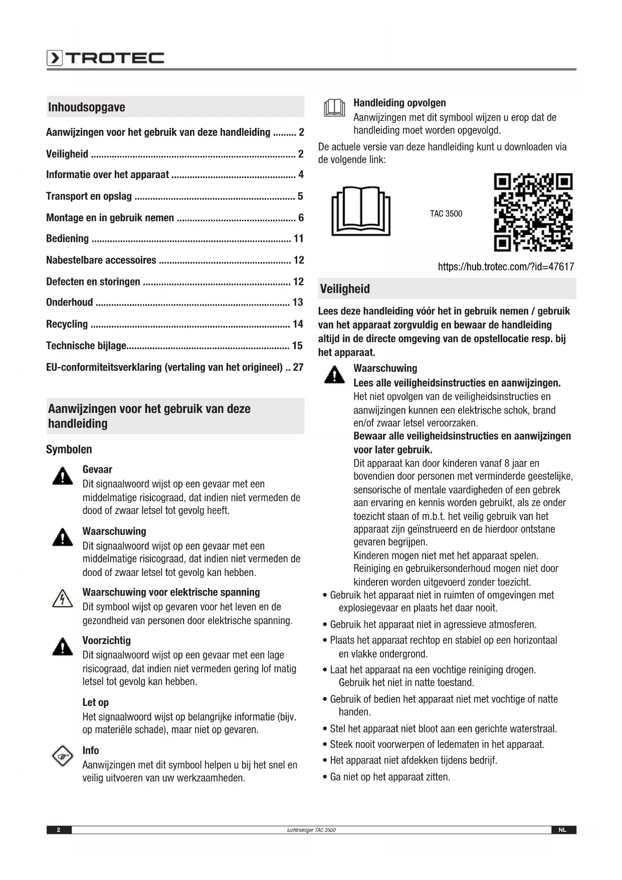 - EU-conformiteitsverklaring (vertaling van het origineel) Aanwijzingen voor het gebruik van deze handleiding Symbolen Gevaar Dit signaalwoord wijst op een gevaar met een middelmatige risicograad, dat indien niet vermeden de dood of zwaar letsel tot gevolg heeft. Waarschuwing Dit signaalwoord wijst op een gevaar met een middelmatige risicograad, dat indien niet vermeden de dood of zwaar letsel tot gevolg kan hebben. Waarschuwing voor elektrische spanning Dit symbool wijst op gevaren voor het leven en de gezondheid van personen door elektrische spanning. Voorzichtig Dit signaalwoord wijst op een gevaar met een lage risicograad, dat indien niet vermeden gering lof matig letsel tot gevolg kan hebben. Let op Het signaalwoord wijst op belangrijke informatie (bijv. op materiële schade), maar niet op gevaren. Info Aanwijzingen met dit symbool helpen u bij het snel en veilig uitvoeren van uw werkzaamheden. Handleiding opvolgen Aanwijzingen met dit symbool wijzen u erop dat de handleiding moet worden opgevolgd. De actuele versie van deze handleiding kunt u downloaden via de volgende link: TAC 3500 https://hub.trotec.com/?id=47617 Veiligheid Lees deze handleiding vóór het in gebruik nemen / gebruik van het apparaat zorgvuldig en bewaar de handleiding altijd in de directe omgeving van de opstellocatie resp. bij het apparaat. Waarschuwing Lees alle veiligheidsinstructies en aanwijzingen. Het niet opvolgen van de veiligheidsinstructies en aanwijzingen kunnen een elektrische schok, brand en/of zwaar letsel veroorzaken. Bewaar alle veiligheidsinstructies en aanwijzingen voor later gebruik. Dit apparaat kan door kinderen vanaf 8 jaar en bovendien door personen met verminderde geestelijke, sensorische of mentale vaardigheden of een gebrek aan ervaring en kennis worden gebruikt, als ze onder toezicht staan of m.b.t. het veilig gebruik van het apparaat zijn geïnstrueerd en de hierdoor ontstane gevaren begrijpen. Kinderen mogen niet met het apparaat spelen. Reiniging en gebruikersonderhoud mogen niet door kinderen worden uitgevoerd zonder toezicht. p. 27