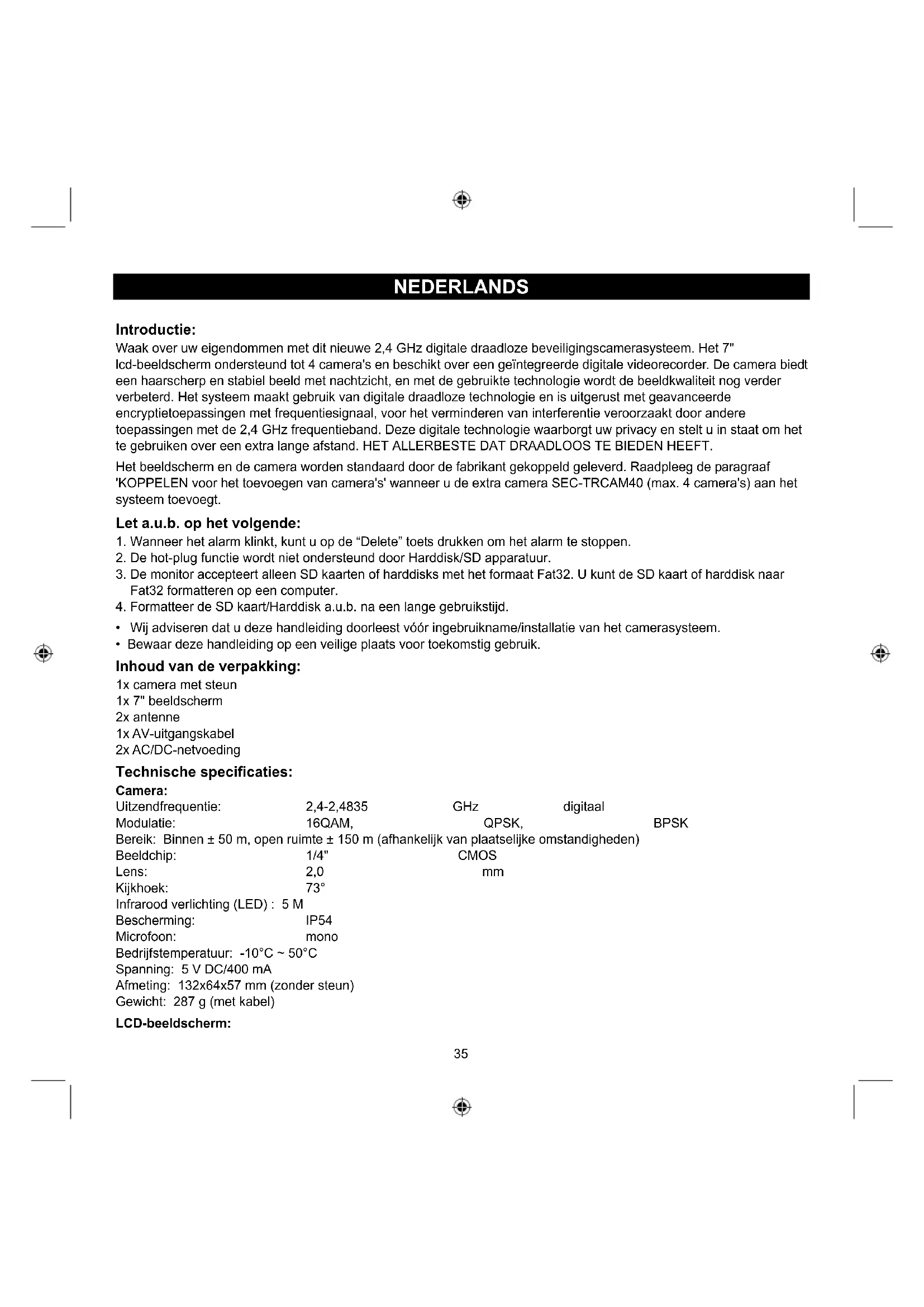 - Bewaar deze handleiding op een veilige plaats voor toekomstig gebruik. Inhoud van de verpakking: 1x camera met steun 1x 7" beeldscherm 2x antenne 1x AV-uitgangskabel 2x AC/DC-netvoeding Technische specificaties: Camera: Uitzendfrequentie: 2,4-2,4835 GHz digitaal Modulatie: 16QAM, QPSK, BPSK Bereik: Binnen ± 50 m, open ruimte ± 150 m (afhankelijk van plaatselijke omstandigheden) Beeldchip: 1/4" CMOS Lens: 2,0 mm Kijkhoek: 73° Infrarood verlichting (LED) : 5 M Bescherming: IP54 Microfoon: mono Bedrijfstemperatuur: -10°C ~ 50°C Spanning: 5 V DC/400 mA Afmeting: 132x64x57 mm (zonder steun) Gewicht: 287 g (met kabel) LCD-beeldscherm:36 Ontvangstfrequentie: 2,4-2,4835 GHz digitaal Kanalen: 4 Afmeting: 7" TFT/LCD Max. resolutie: 800 RGB (H)* 480 (V) pixels SD-kaart: tot maximaal 32 GB (niet inbegrepen) Video beeldsnelheid: 25 fps (max.) 10 fps (4x camera's) Opnamebeeldsnelheid: 25 fps per kanaal Videoresolutie: CIF/VGA Videoformaat: AVI USB: 2,0 Menutaal: Engels, Duits, Frans en Nederlands Video-uitgangsniveau: 1 Vp-p/75 Ohm Audio-uitgangsniveau: 2Vrms@600ohm mono Audio/video-uitgangsconnector: 2,5 mm aansluiting (met 2,5 mm kabel tot 3 x RCA) Bereik: Binnen ± 50 m, open ruimte ± 150 m (afhankelijk van plaatselijke omstandigheden) Bedrijfstemperatuur: 0°C tot +40°C Spanning: 5 V DC/650 mA Afmeting: 214x157x26 mm Gewicht: 488 g Veiligheidsmaatregelen: