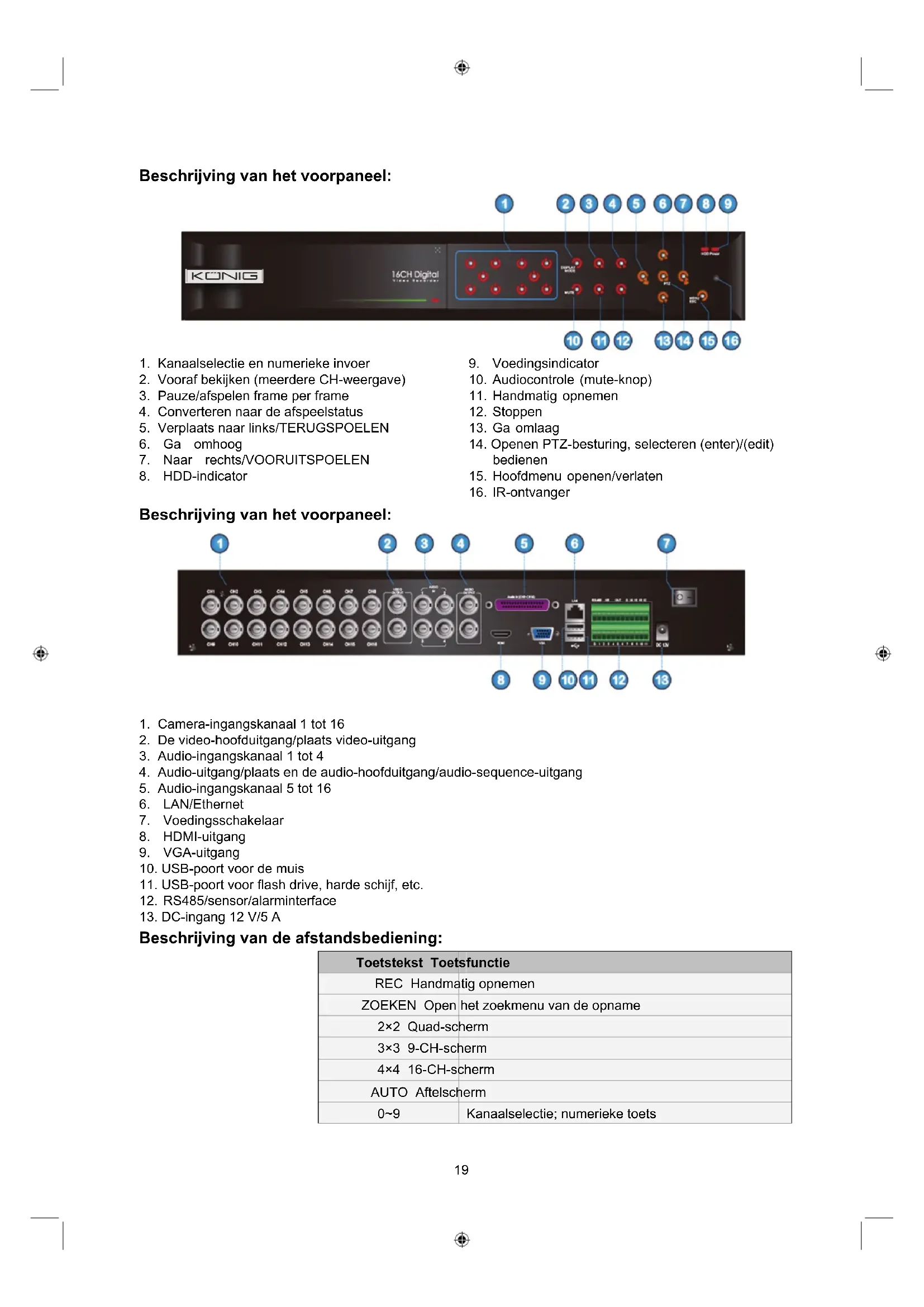 Beschrijving van de afstandsbediening: Toetstekst Toetsfunctie REC Handmatig opnemen ZOEKEN Open het zoekmenu van de opname 2×2 Quad-scherm 3×3 9-CH-scherm 4×4 16-CH-scherm AUTO Aftelscherm 0~9 Kanaalselectie; numerieke toets20 WEERGAVEMODUS Meerdere CH-scherm (Quad, 9CH, 16CH, enkel kanaalscherm) ▲ OMHOOG ▼ OMLAAG