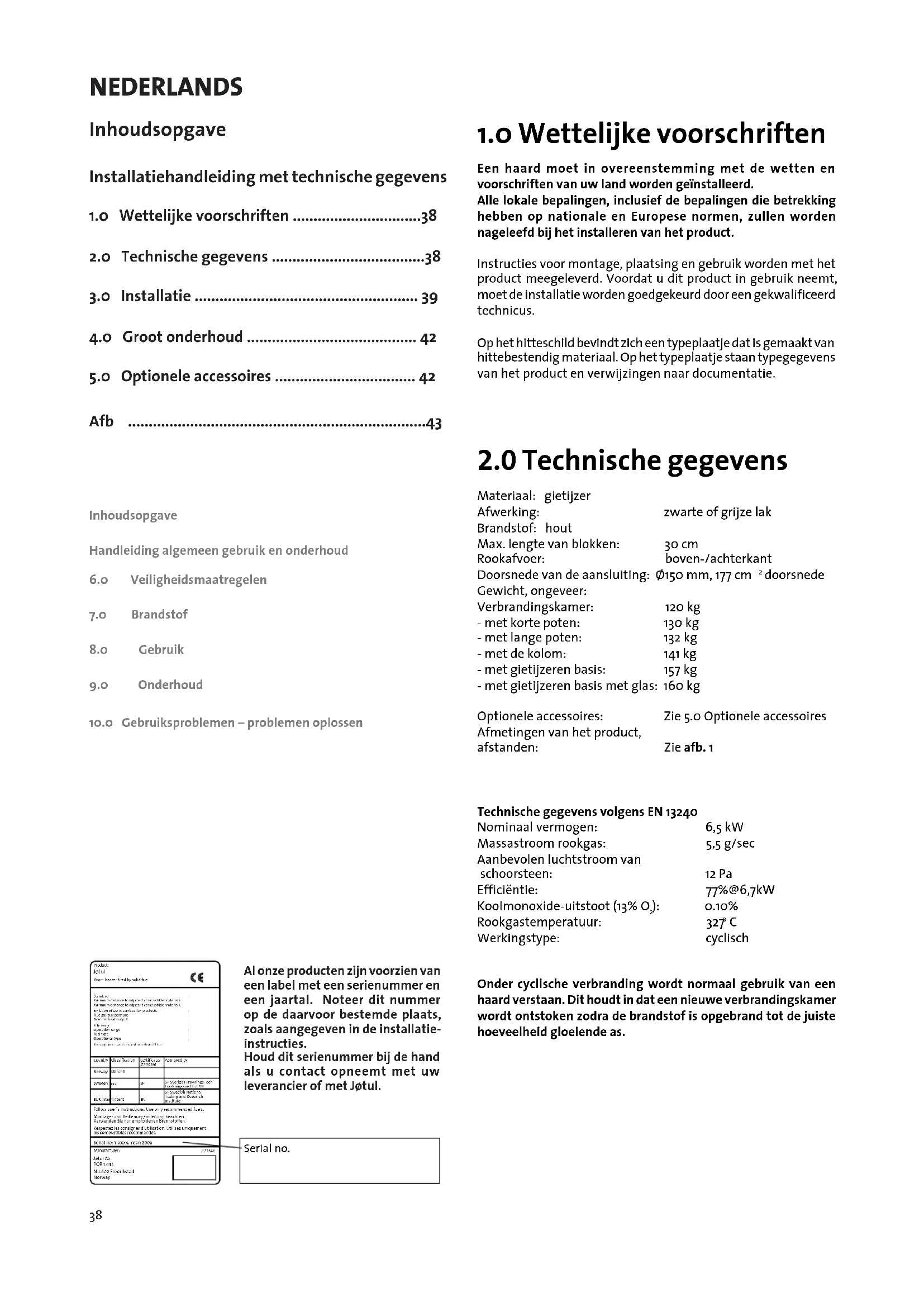 Al once producten zijn voorzien van een label met een serienummer en een jaartal. Noteer dit nummer op de waarvoort bestemde plaats, zoals aangegeven in de installment-instructies.