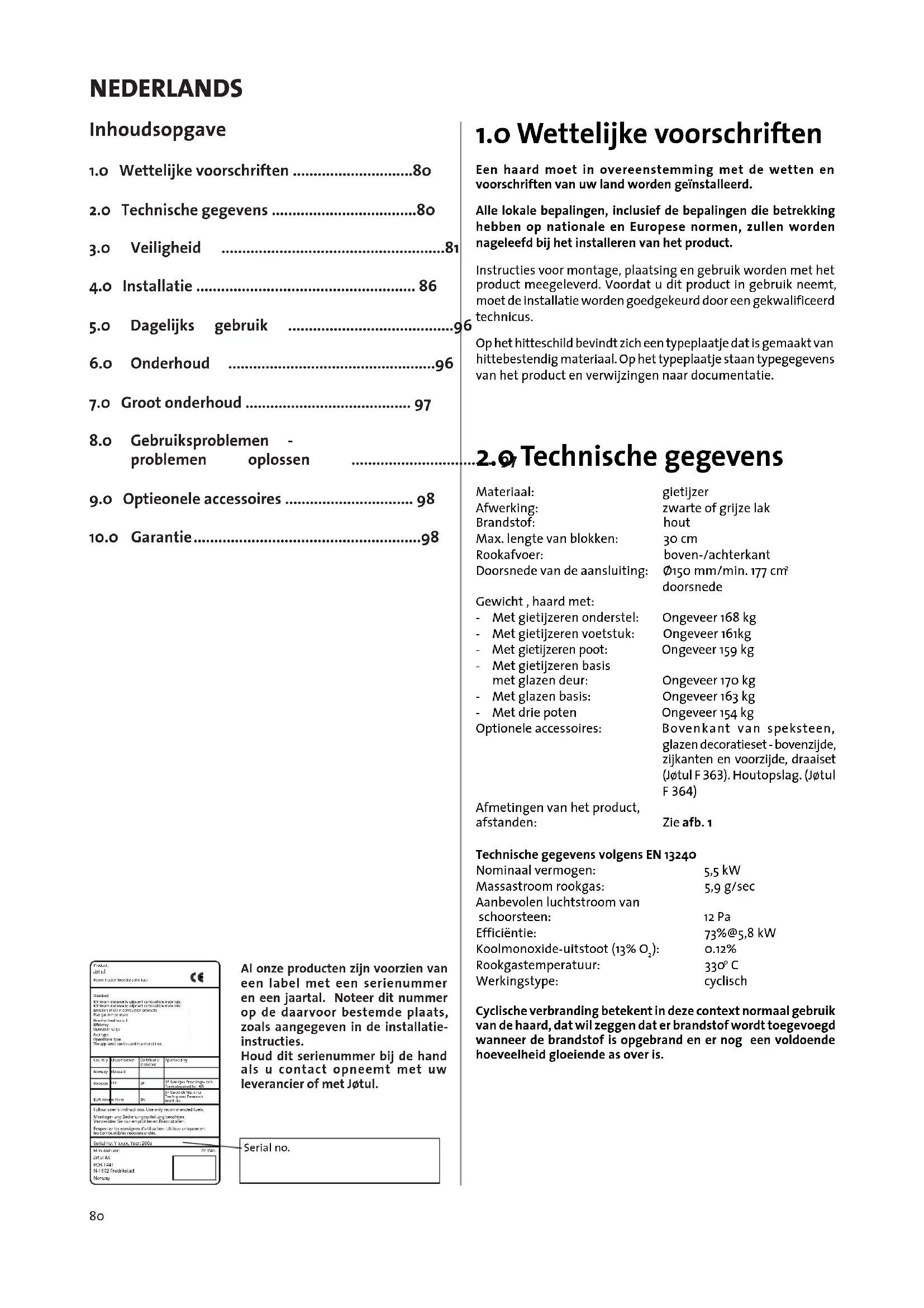 Houd dit serienummer bij de hand als u contact opneemt met uw leverancier of met Jotul.
