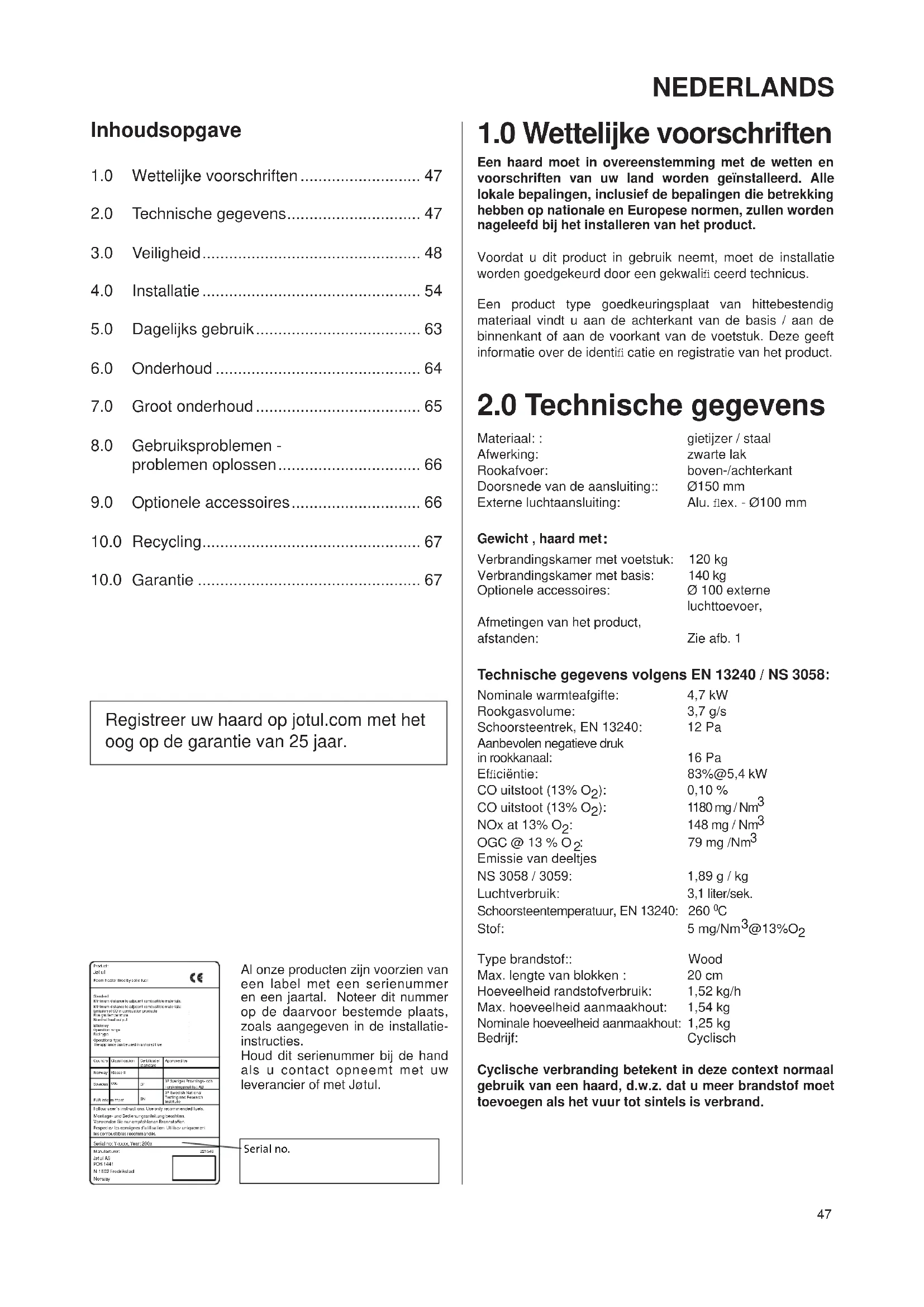 Jøtul AS garandeert dat de externe gietijzeren onderdelen vrij zijn van materiaal- en fabricagefouten op het moment van aankoop. U kunt de garantie op de externe gietijzeren onderdelen verlengen tot 25 jaar na de leverdatum door het product te registreren op jotul.com en het bewijs van deze verlengde garantie binnen drie maanden na aankoop uit te printen. We adviseren u het garantiebewijs samen met de aankoopbon te bewaren. Jøtul AS garandeert tevens dat de staalplaten onderdelen vrij zijn van materiaal- en fabricagefouten op het moment van aankoop en tot 5 jaar na de leverdatum. Deze garantie geldt op voorwaarde dat de kachel is geïnstalleerd door een erkende installateur, overeenkomstig de geldende wet- en regelgeving en Jøtul’s installatie- en gebruiksinstructies. Gerepareerde producten en vervangende onderdelen vallen onder de garantie gedurende het resterende deel van de oorspronkelijke garantieperiode.