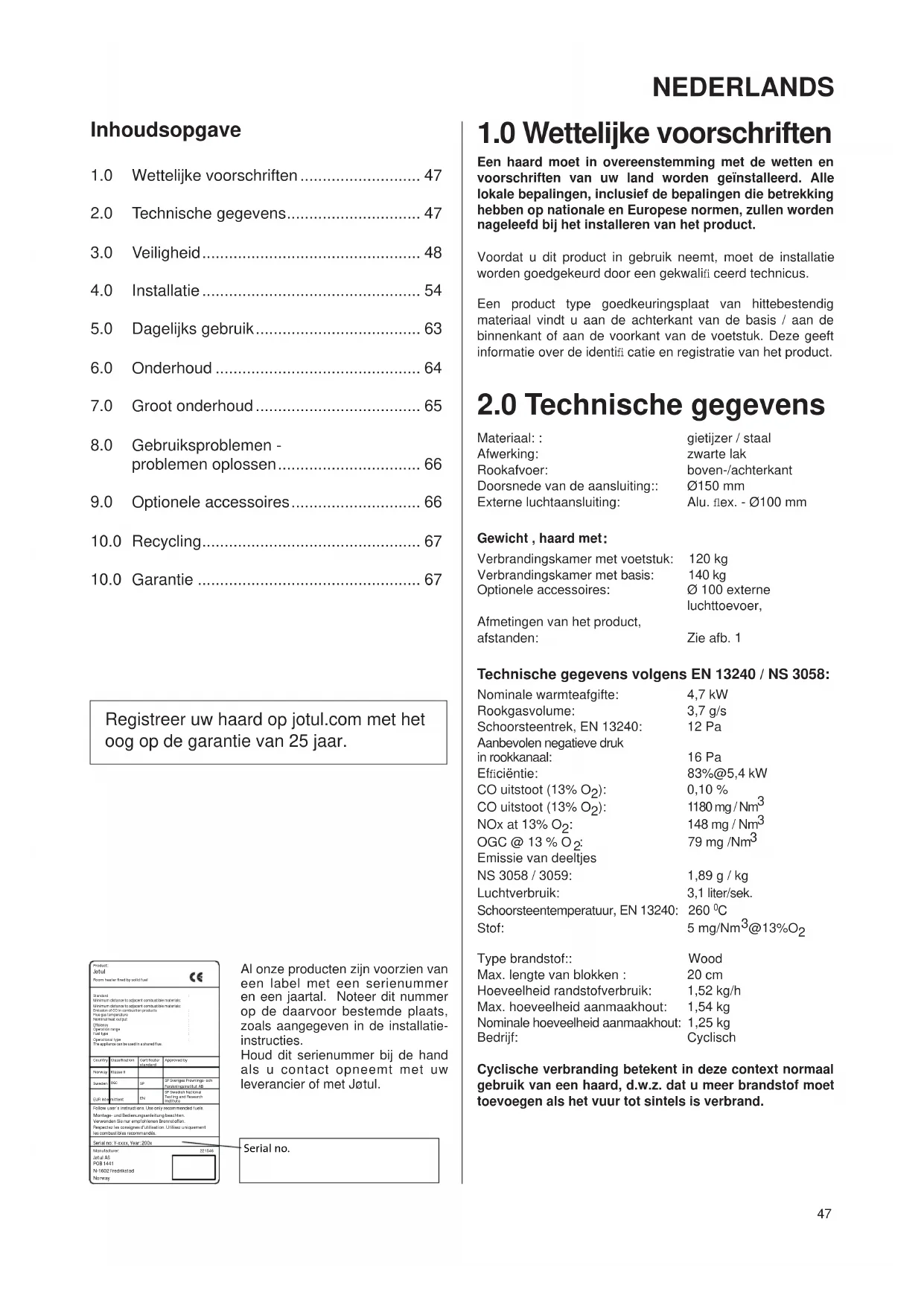 Jøtul AS garandeert dat de externe gietijzeren onderdelen vrij zijn van materiaal- en fabricagefouten op het moment van aankoop. U kunt de garantie op de externe gietijzeren onderdelen verlengen tot 25 jaar na de leverdatum door het product te registreren op jotul.com en het bewijs van deze verlengde garantie binnen drie maanden na aankoop uit te printen. We adviseren u het garantiebewijs samen met de aankoopbon te bewaren. Jøtul AS garandeert tevens dat de staalplaten onderdelen vrij zijn van materiaal- en fabricagefouten op het moment van aankoop en tot 5 jaar na de leverdatum. Deze garantie geldt op voorwaarde dat de kachel is geïnstalleerd door een erkende installateur, overeenkomstig de geldende wet- en regelgeving en Jøtul’s installatie- en gebruiksinstructies. Gerepareerde producten en vervangende onderdelen vallen onder de garantie gedurende het resterende deel van de oorspronkelijke garantieperiode.
