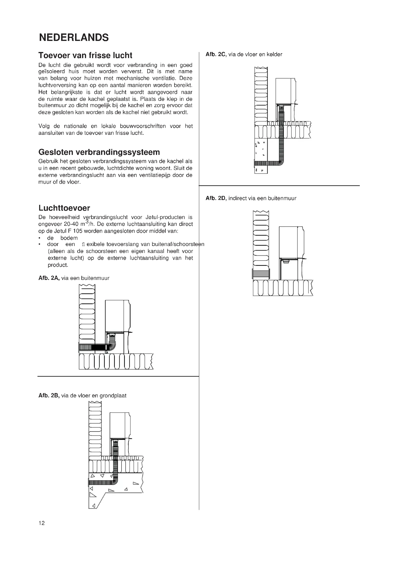 - door een fl exibele toevoerslang van buitenaf/schoorsteen (alleen als de schoorsteen een eigen kanaal heeft voor externe lucht) op de externe luchtaansluiting van het product. Afb. 2A, via een buitenmuur Afb. 2B, via de vloer en grondplaat Afb. 2C, via de vloer en kelder Afb. 2D, indirect via een buitenmuur NEDERLANDS13 NEDERLANDS