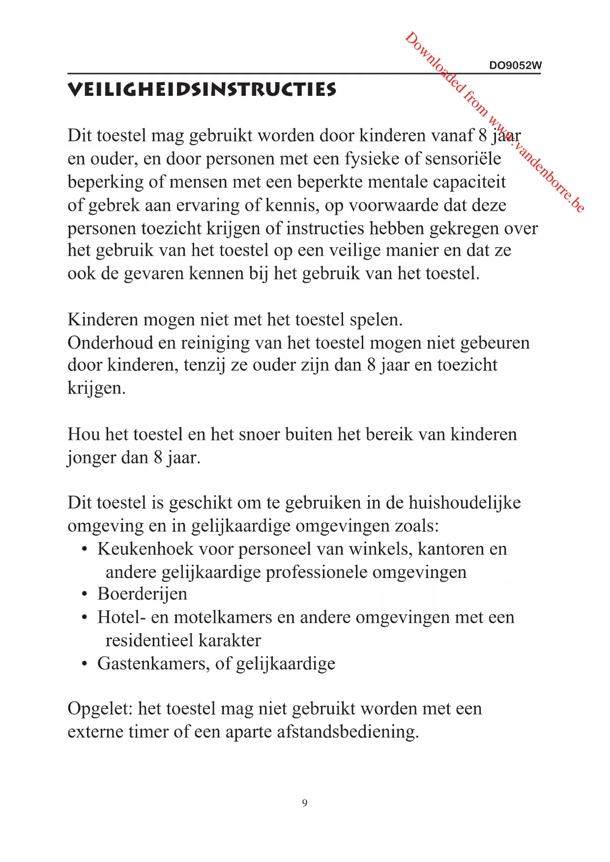 - Gastenkamers, of gelijkaardige Opgelet: het toestel mag niet gebruikt worden met een externe timer of een aparte afstandsbediening. Downloaded from www.vandenborre.beDO9052W