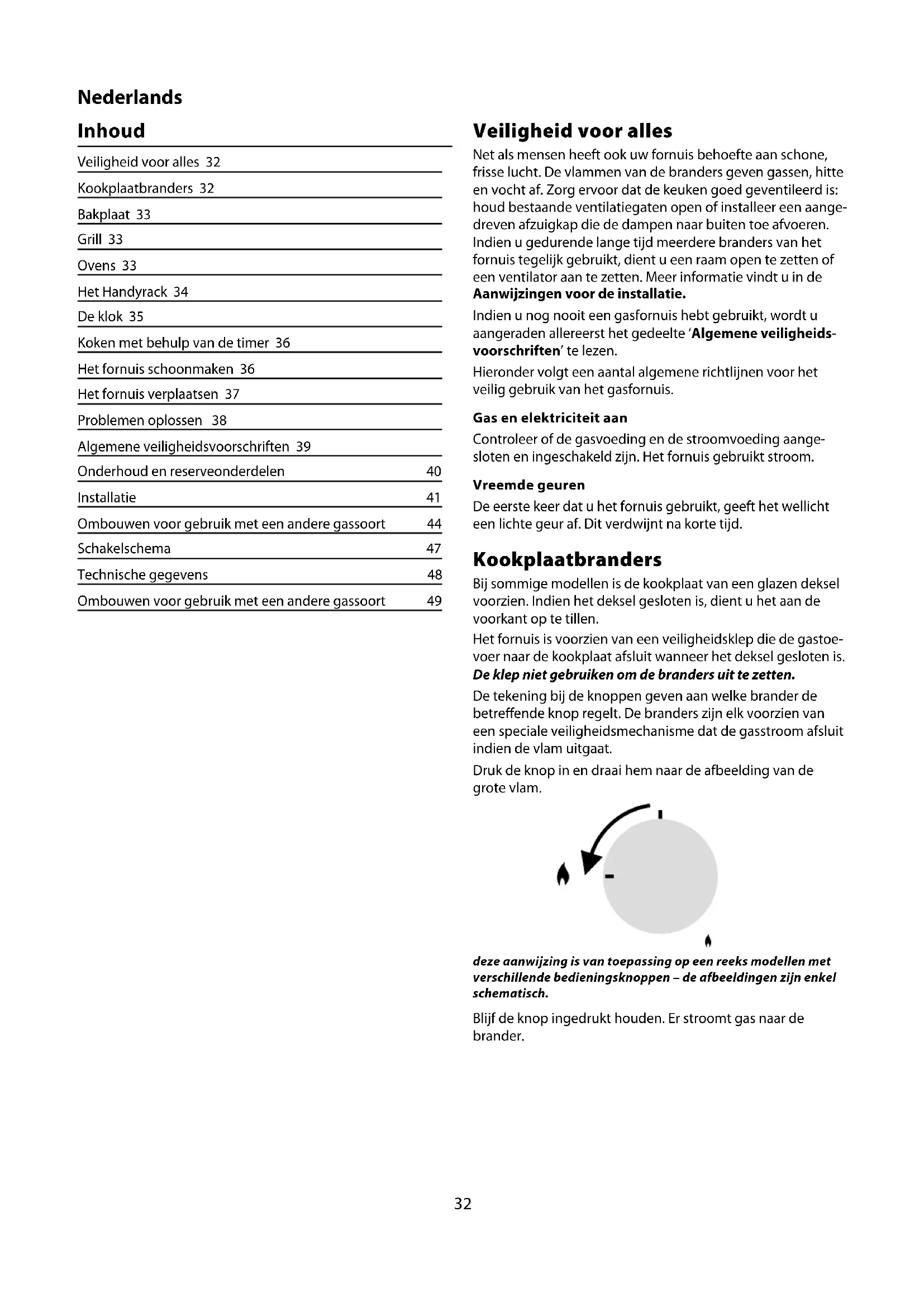 Veiligheid voor alles Net als mensen heeft ook uw fornuis behoefte aan schone, frisse lucht. De vlammen van de branders geven gassen, hitte en vocht af. Zorg ervoor dat de keuken goed geventileerd is: houd bestaande ventilatiegaten open of installeer een aange- dreven afzuigkap die de dampen naar buiten toe afvoeren. Indien u gedurende lange tijd meerdere branders van het fornuis tegelijk gebruikt, dient u een raam open te zetten of een ventilator aan te zetten. Meer informatie vindt u in de Aanwijzingen voor de installatie. Indien u nog nooit een gasfornuis hebt gebruikt, wordt u aangeraden allereerst het gedeelte ‘Algemene veiligheids- voorschriften’ te lezen. Hieronder volgt een aantal algemene richtlijnen voor het veilig gebruik van het gasfornuis. Gas en elektriciteit aan Controleer of de gasvoeding en de stroomvoeding aange- sloten en ingeschakeld zijn. Het fornuis gebruikt stroom. Vreemde geuren De eerste keer dat u het fornuis gebruikt, geeft het wellicht een lichte geur af. Dit verdwijnt na korte tijd. Kookplaatbranders Bij sommige modellen is de kookplaat van een glazen deksel voorzien. Indien het deksel gesloten is, dient u het aan de voorkant op te tillen. Het fornuis is voorzien van een veiligheidsklep die de gastoe- voer naar de kookplaat afsluit wanneer het deksel gesloten is. De klep niet gebruiken om de branders uit te zetten. De tekening bij de knoppen geven aan welke brander de betreende knop regelt. De branders zijn elk voorzien van een speciale veiligheidsmechanisme dat de gasstroom afsluit indien de vlam uitgaat. Druk de knop in en draai hem naar de afbeelding van de grote vlam. deze aanwijzing is van toepassing op een reeks modellen met verschillende bedieningsknoppen – de afbeeldingen zijn enkel schematisch. Blijf de knop ingedrukt houden. Er stroomt gas naar de brander. Inhoud Veiligheid voor alles 32 Kookplaatbranders 32 Bakplaat 33 Grill 33 Ovens 33 Het Handyrack 34 De klok 35 Koken met behulp van de timer 36 Het fornuis schoonmaken 36 Het fornuis verplaatsen 37 Problemen oplossen 38 Algemene veiligheidsvoorschriften 39 Onderhoud en reserveonderdelen 40 Installatie 41 Ombouwen voor gebruik met een andere gassoort 44 Schakelschema 47 Technische gegevens 48 Ombouwen voor gebruik met een andere gassoort 49Nederlands