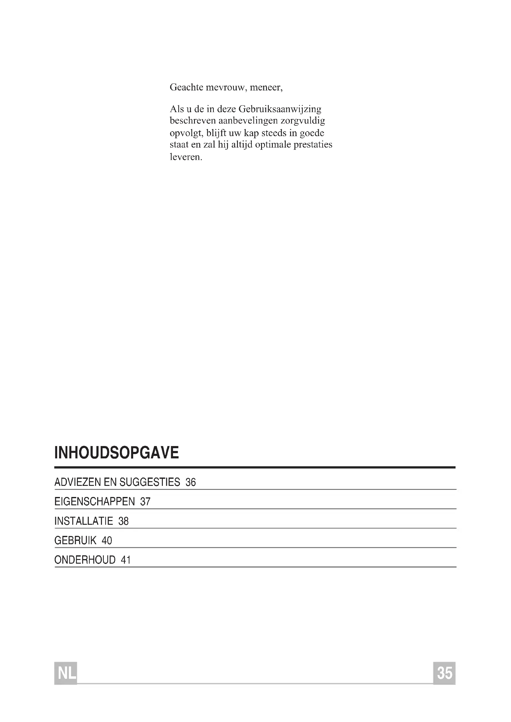 - De wasemkap is uitsluitend ontworpen voor huishoudelijk gebruik, voor het elimineren van kookgeuren. Gebruik de kap nooit op oneigenlijke wijze.