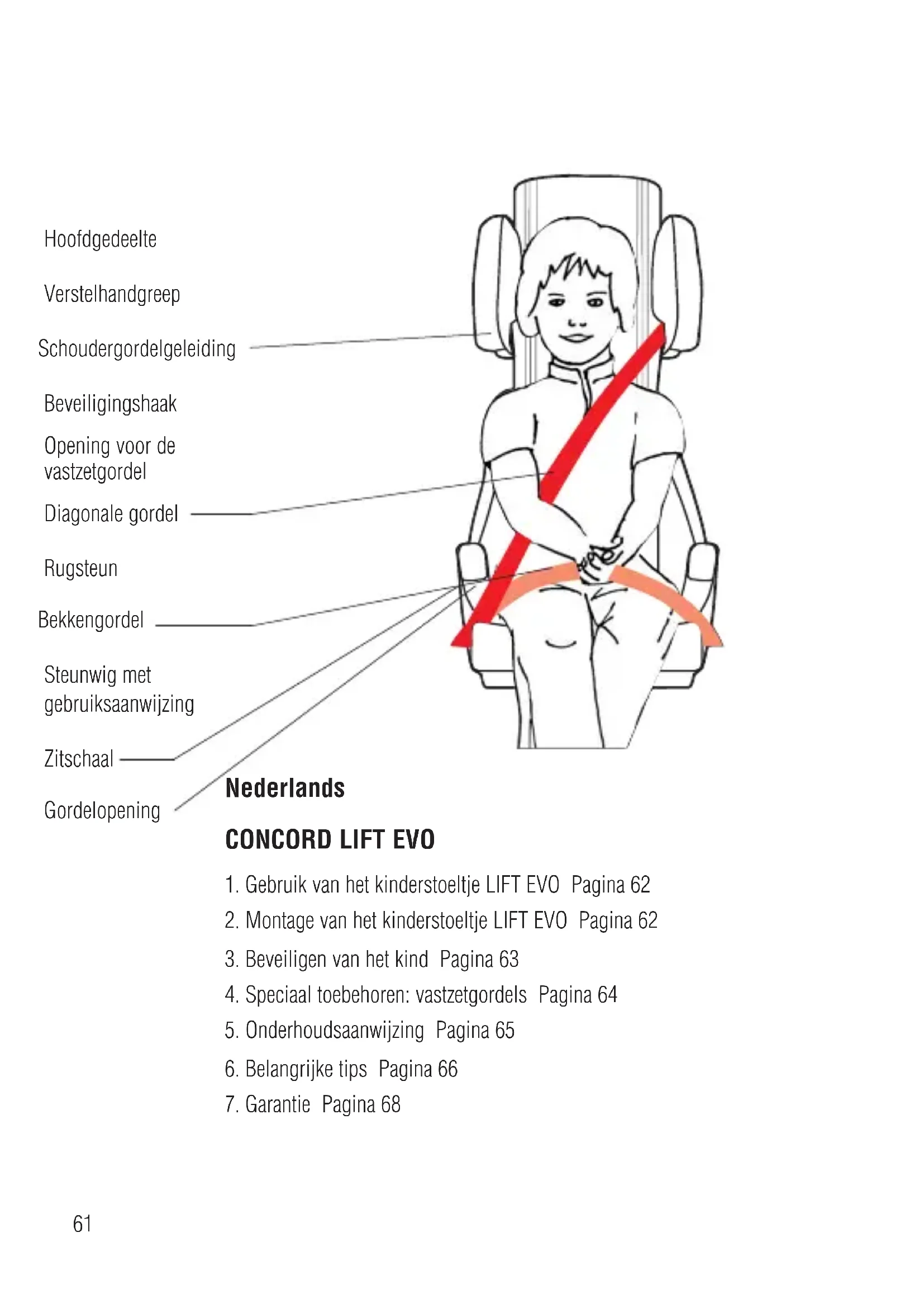 - Geschikt voor auto‘s met driepuntsgordel die overeenkomstig ECE-regeling 16 resp. vergelijkbare norm zijn getest. NL68 Door de zeer lange gebruiksduur van het kinderstoeltje (LIFT EVO) is het natuurlijk dat stoelbekledingen en overige gebruiksonderdelen afhankelijk van de gebruiksduur en gebruiksintensiteit afzonderlijk van elkaar slijten en vervangen moeten worden. Daarom kunnen er geen minimum houdbaarheidsgaranties worden gegeven die langer zijn dan een garantieduur van 6 maanden. Wendt u zich voor reserveonderdelen tot uw kinder- of babyspeciaalzaak, naar de gespecialiseerde afdelingen van warenhuizen, de autoaccessoirebranche of postorderbedrijven. Daar vindt u ook het volledige toebehorenprogramma voor CONCORD-kinderstoeltjes. Het kinderstoeltje LIFT EVO is getest bij een gesimuleerde frontale botsing met een snelheid van 50 km/h tegen een vast obstakel. Dit komt overeen met de internationale testnorm ECE R 44 03 die als basis dient voor alle geteste kinderbeveiligingssystemen. Bij correct gebruik en inachtneming van de inbouw- en gebruiksa- anwijzing moeten de ingebouwde voorzieningen bij kinderen van ca. 3 - 12 jaar resp. met een lichaamsgewicht van 15 tot 36 kg in het geval van een ongeval - afhankelijk van het type en de ernst van het ongeval - letsel voorkomen of verminderen. Evenals het gebruik van veiligheidsgordels voor volwassenen vervangt daarom een kinderbeveiligingssysteem niet verantwoordelijk en voorzichtig gedrag in het verkeer.