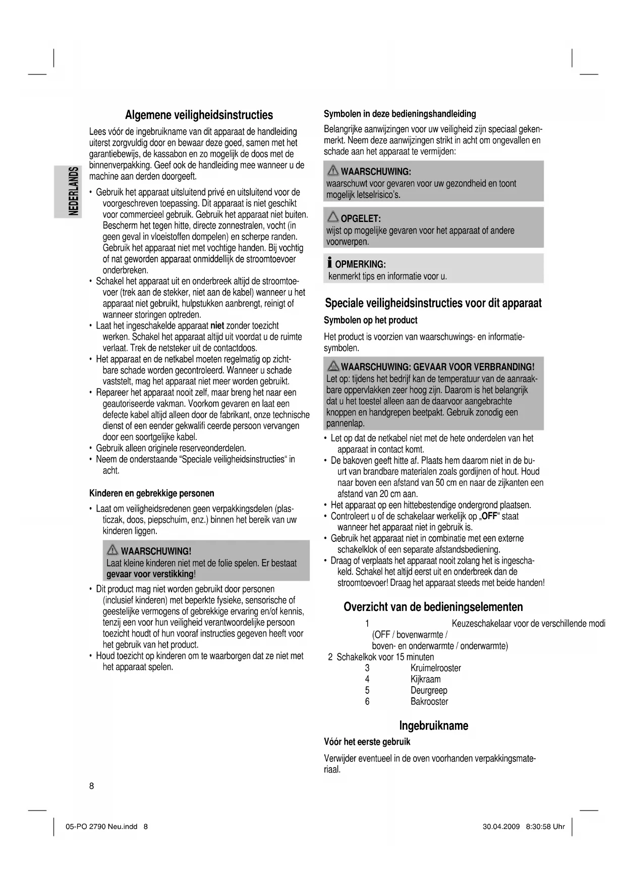 - Draag of verplaats het apparaat nooit zolang het is ingescha- keld. Schakel het altijd eerst uit en onderbreek dan de stroomtoevoer! Draag het apparaat steeds met beide handen! Overzicht van de bedieningselementen 1 Keuzeschakelaar voor de verschillende modi (OFF / bovenwarmte / boven- en onderwarmte / onderwarmte) 2 Schakelkok voor 15 minuten 3 Kruimelrooster 4 Kijkraam 5 Deurgreep 6 Bakrooster Ingebruikname Vóór het eerste gebruik Verwijder eventueel in de oven voorhanden verpakkingsmate- riaal. 05-PO 2790 Neu.indd 805-PO 2790 Neu.indd 8 30.04.2009 8:30:58 Uhr30.04.2009 8:30:58 Uhr9 NEDERLANDS NEDERLANDS OPGELET: Houd het (lege!) apparaat vóór de eerste inbedrijfstelling gedurende 15 minuten ingeschakeld om de beschermlaag aan de verwarmingsspiraal te verwijderen. Zet de temperatu- urregelaar op 250 °C. OPMERKING: Lichte rook- en stankontwikkeling zijn bij deze procedure normaal. Zorg voor voldoende ventilatie. Bediening