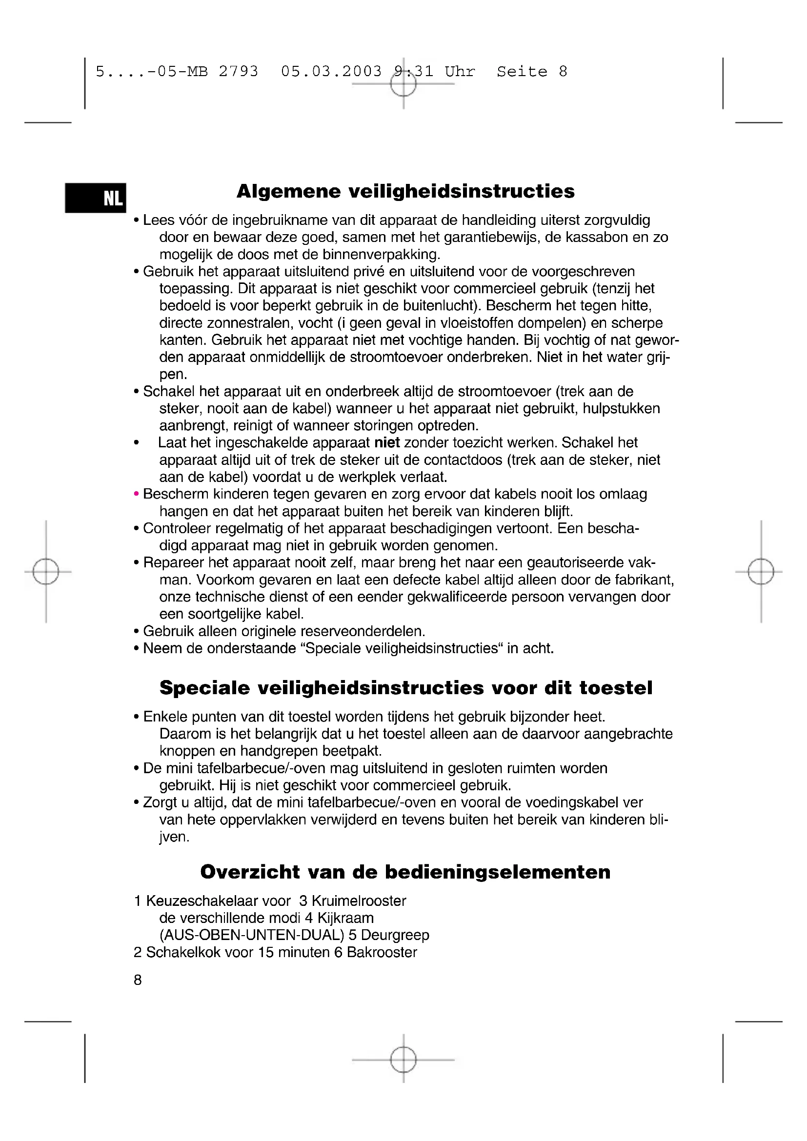 5....-05-MB 2793 05.03.2003 9:31 Uhr Seite 9Product Aantal/hoeveelheid Gaartijd Verwarmingssoort Lamsteaks 2 – 3 11 – 14 Min. per kant bovenwarmte Kip 1 helft 15 – 20 Min. per kant bovenwarmte Deze tijden zijn slechts richtwaarden en kunnen al naar gelang de omstandigheden variëren. Reiniging