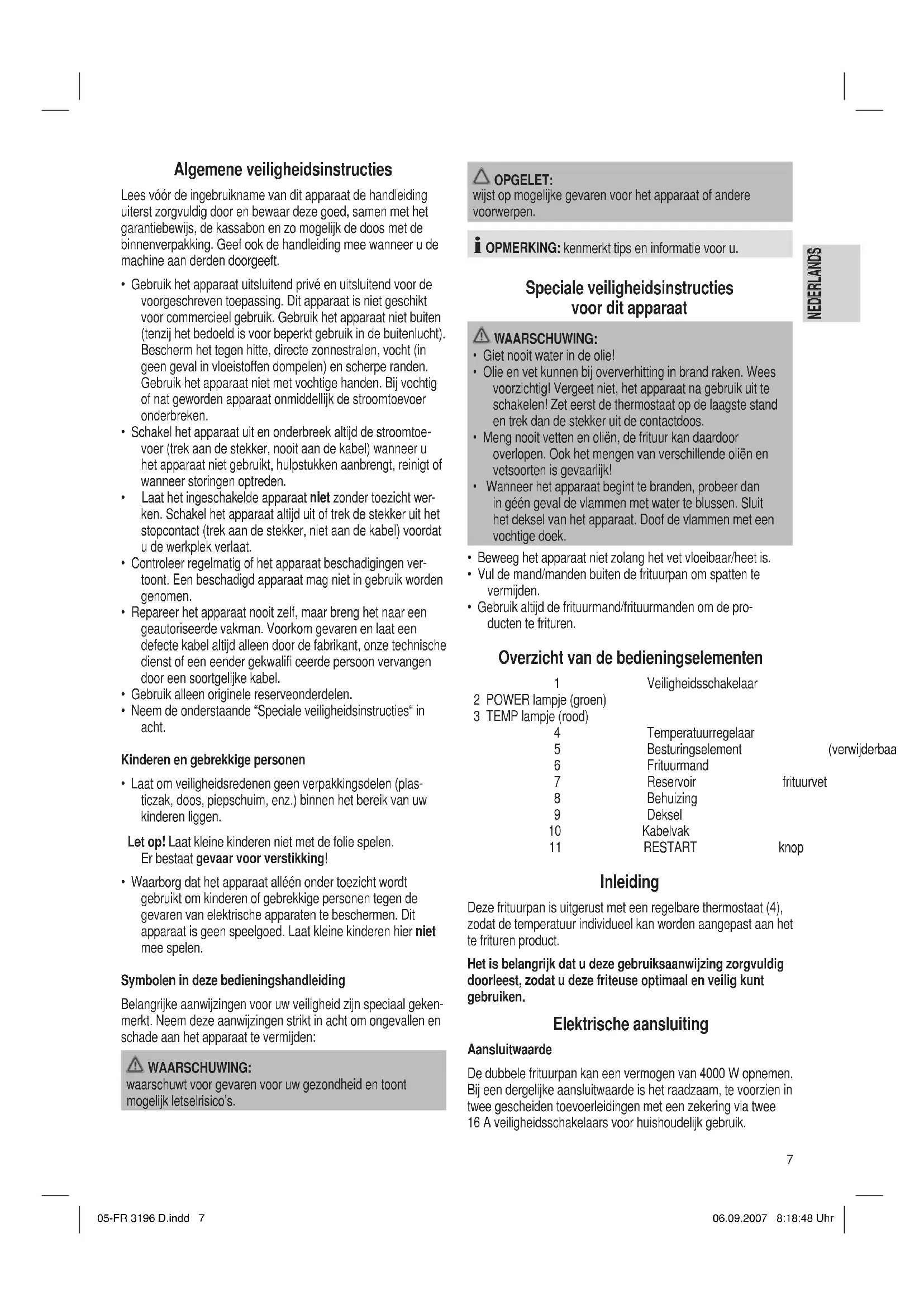 - Gebruik altijd de frituurmand/frituurmanden om de pro- ducten te frituren. Overzicht van de bedieningselementen 1 Veiligheidsschakelaar 2 POWER lampje (groen) 3 TEMP lampje (rood) 4 Temperatuurregelaar 5 Besturingselement (verwijderbaar) 6 Frituurmand 7 Reservoir frituurvet 8 Behuizing 9 Deksel 10 Kabelvak 11 RESTART knop Inleiding Deze frituurpan is uitgerust met een regelbare thermostaat (4), zodat de temperatuur individueel kan worden aangepast aan het te frituren product. Het is belangrijk dat u deze gebruiksaanwijzing zorgvuldig doorleest, zodat u deze friteuse optimaal en veilig kunt gebruiken. Elektrische aansluiting Aansluitwaarde De dubbele frituurpan kan een vermogen van 4000 W opnemen. Bij een dergelijke aansluitwaarde is het raadzaam, te voorzien in twee gescheiden toevoerleidingen met een zekering via twee 16 A veiligheidsschakelaars voor huishoudelijk gebruik. 05-FR 3196 D.indd 705-FR 3196 D.indd 7 06.09.2007 8:18:48 Uhr06.09.2007 8:18:48 Uhr8 NEDERLANDS NEDERLANDS Het apparaat mag alleen worden aangesloten op een correct geïnstalleerde geaarde contactdoos 230 V, 50 Hz. Iedere zijde van de frituurpan kan ook afzonderlijk worden ge- bruikt, omdat het apparaat over twee toevoerleidingen beschikt. OPGELET: OVERBELASTING Gebruik géén verlengsnoeren of meervoudige contactdo- zen omdat dit apparaat te veel vermogen heeft. Ingebruikname Vóór de eerste ingebruikname