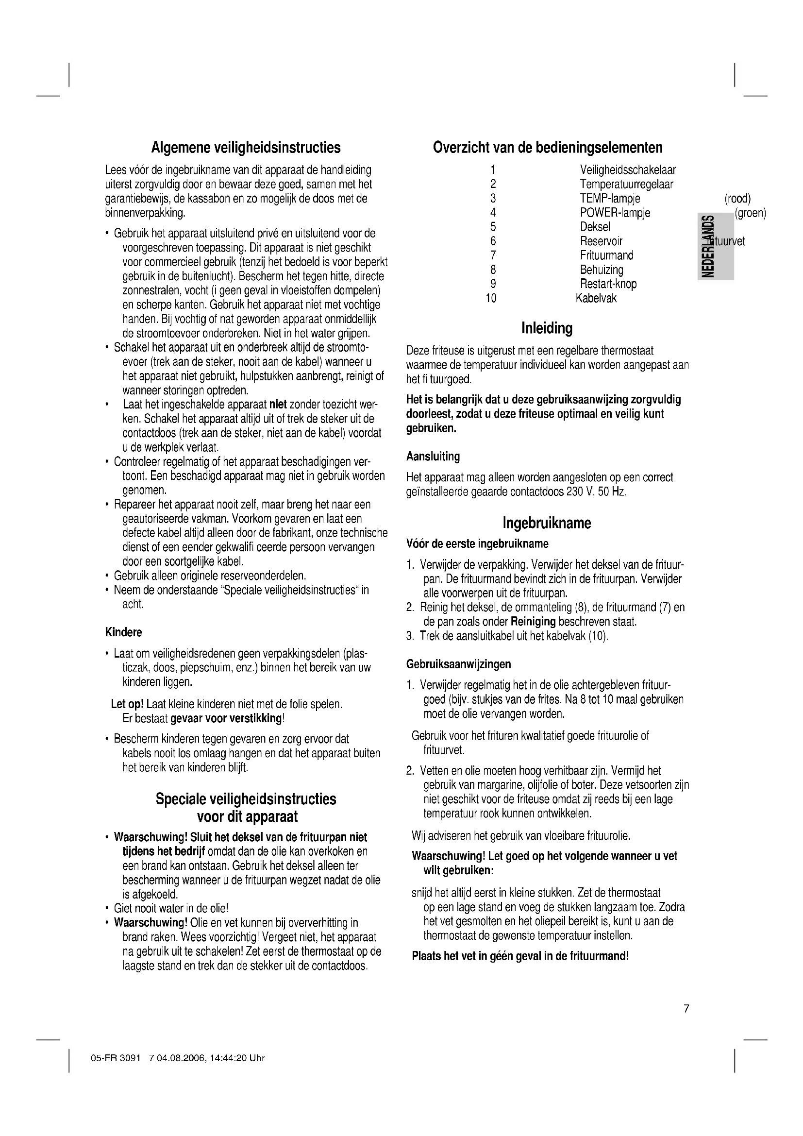 - Waarschuwing! Olie en vet kunnen bij oververhitting in brand raken. Wees voorzichtig! Vergeet niet, het apparaat na gebruik uit te schakelen! Zet eerst de thermostaat op de laagste stand en trek dan de stekker uit de contactdoos. Overzicht van de bedieningselementen 1 Veiligheidsschakelaar 2 Temperatuurregelaar 3 TEMP-lampje (rood) 4 POWER-lampje (groen) 5 Deksel 6 Reservoir frituurvet 7 Frituurmand 8 Behuizing 9 Restart-knop 10 Kabelvak Inleiding Deze friteuse is uitgerust met een regelbare thermostaat waarmee de temperatuur individueel kan worden aangepast aan het fi tuurgoed. Het is belangrijk dat u deze gebruiksaanwijzing zorgvuldig doorleest, zodat u deze friteuse optimaal en veilig kunt gebruiken. Aansluiting Het apparaat mag alleen worden aangesloten op een correct geïnstalleerde geaarde contactdoos 230 V, 50 Hz. Ingebruikname Vóór de eerste ingebruikname