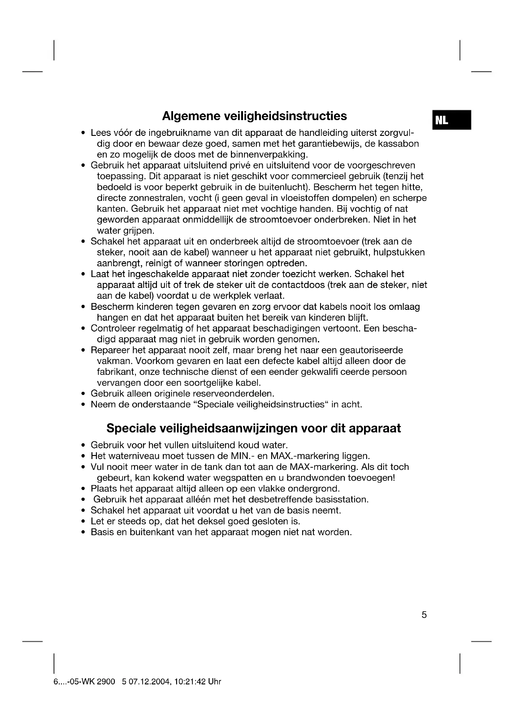 - Basis en buitenkant van het apparaat mogen niet nat worden. 6....-05-WK 2900 5 07.12.2004, 10:21:42 UhrNL