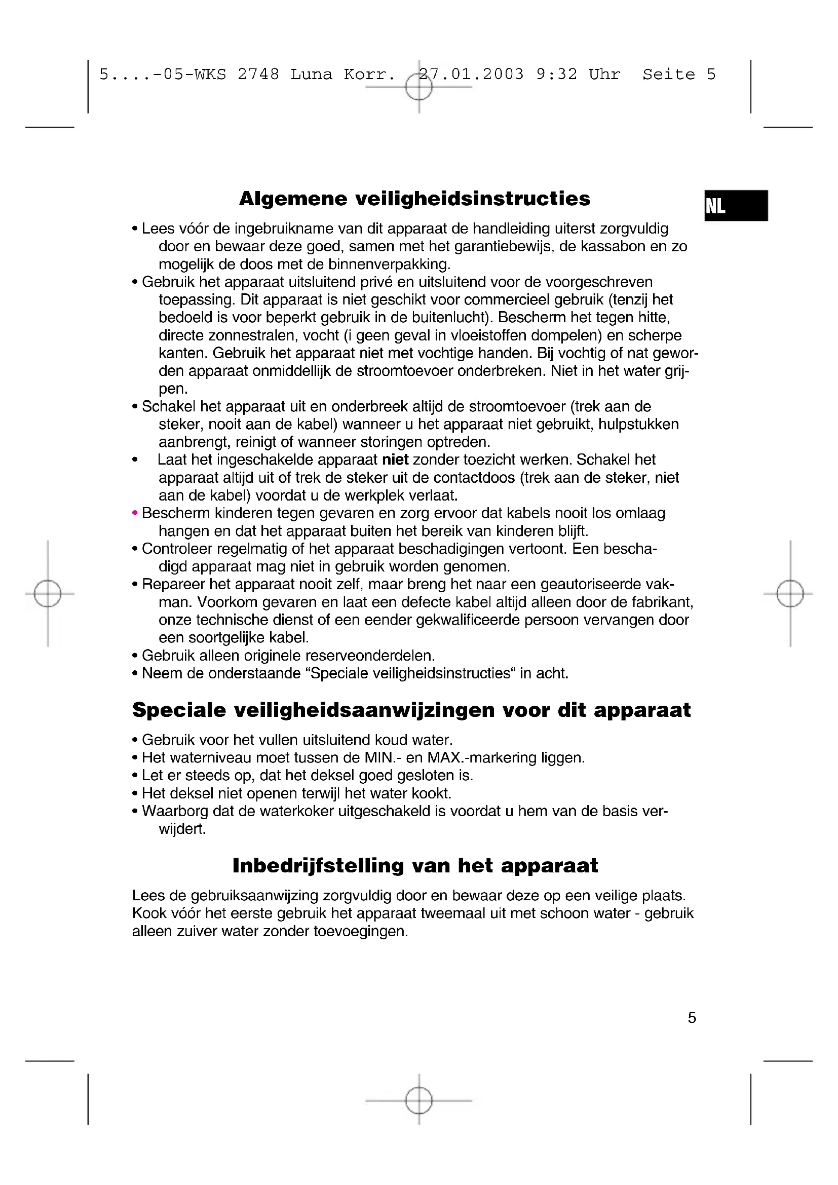 5....-05-WKS 2748 Luna Korr. 27.01.2003 9:32 Uhr Seite 6Dit apparaat is gekeurd conform de op dit moment van toepassing zijnde CE- richtlijnen zoals bijvoorbeeld elektromagnetische compatibiliteit en laagspannings- voorschriften en is geconstrueerd volgens de nieuwste veiligheidstechnische voor- schriften. Technische wijzigingen voorbehouden! Garantie Voor het door ons geleverde apparaat verlenen wij een garantie van 24 maanden vanaf koopdatum (kassabon). Eventuele gebreken aan het apparaat of aan het toebehoren*) die zijn ontstaan door productie- of materiaalfouten verhelpen wij binnen deze periode kosteloos door middel van reparatie of, naar ons oordeel, door vervanging. Eventuele garan- tiegevallen verlengen noch de geldigheidsduur van de garantie, noch begint daar- door een nieuwe garantieperiode! Het koopbewijs geldt als garantiebewijs. Zonder dit bewijs kan geen kosteloze reparatie of vervanging plaatsvinden. Geef in garantiegevallen het complete apparaat in de originele verpakking samen met de kassabon af bij uw handelaar. *) Schade aan onderdelen leidt niet automatisch tot kosteloze vervanging van het complete apparaat. Neem in dit geval contact op met onze hotline! De reparatie van glasbreuk of breuk van kunststofonderdelen wordt altijd berekend! Niet defecten aan de hulpstukken of aan de slijtende onderdelen (bijv. koolborstels, deeghaken, drijfriemen, reserveafstandsbediening, reservetandenborstels, zaag- bladen enz.), maar ook reiniging, onderhoud of de vervanging van slijtende delen vallen niet onder de garantie en geschieden altijd tegen berekening! Bij ingrepen door derden komt de garantieverlening te vervallen. Na de garantieperiode Na afloop van de garantieperiode kunnen reparaties tegen berekening worden uit- gevoerd door de betreffende vakhandelaar of de technische dienst.