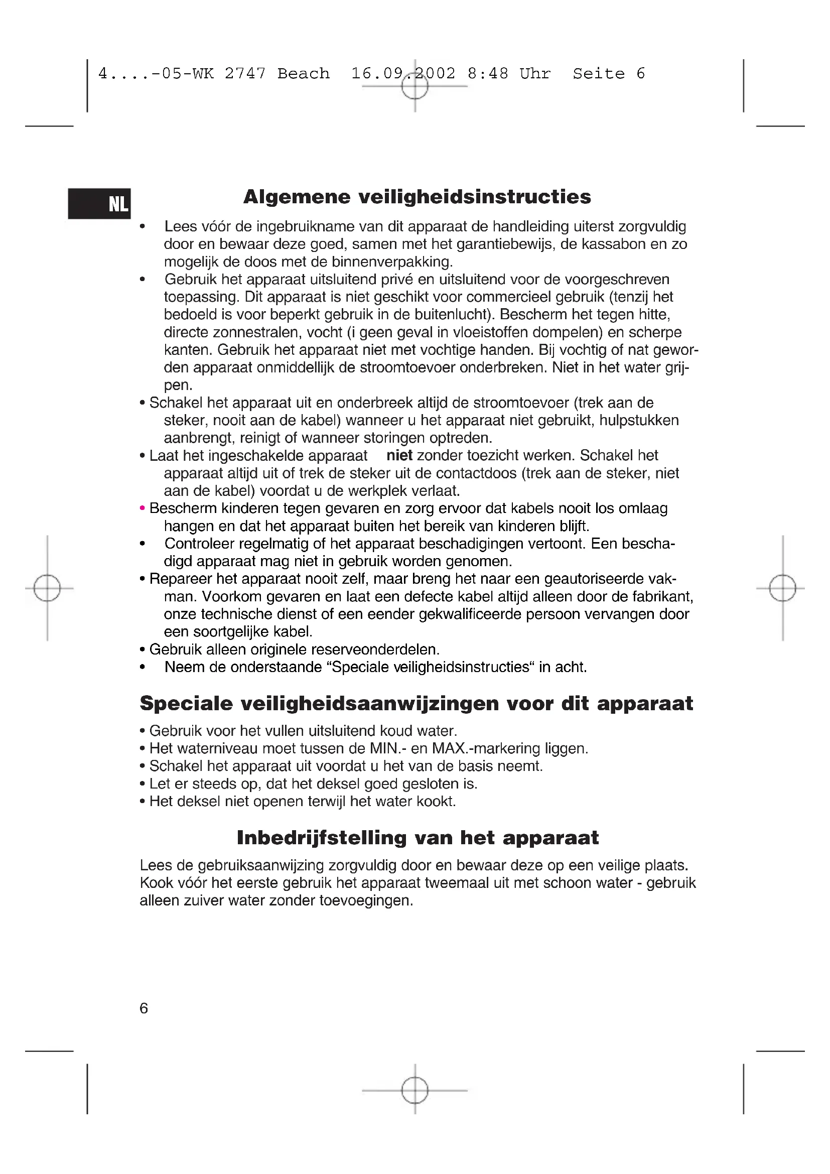 4....-05-WK 2747 Beach 16.09.2002 8:48 Uhr Seite 7Garantie Voor het door ons geleverde apparaat verlenen wij een garantie van 24 maanden vanaf koopdatum (kassabon). Eventuele gebreken aan het apparaat of aan het toebehoren*) die zijn ontstaan door productie- of materiaalfouten verhelpen wij binnen deze periode kosteloos door middel van reparatie of, naar ons oordeel, door vervanging. Eventuele garan- tiegevallen verlengen noch de geldigheidsduur van de garantie, noch begint daar- door een nieuwe garantieperiode! Het koopbewijs geldt als garantiebewijs. Zonder dit bewijs kan geen kosteloze reparatie of vervanging plaatsvinden. Geef in garantiegevallen het complete apparaat in de originele verpakking samen met de kassabon af bij uw handelaar. *) Schade aan onderdelen leidt niet automatisch tot kosteloze vervanging van het complete apparaat. Neem in dit geval contact op met onze hotline! De reparatie van glasbreuk of breuk van kunststofonderdelen wordt altijd berekend! Niet defecten aan de hulpstukken of aan de slijtende onderdelen (bijv. koolborstels, deeghaken, drijfriemen, reserveafstandsbediening, reservetandenborstels, zaag- bladen enz.), maar ook reiniging, onderhoud of de vervanging van slijtende delen vallen niet onder de garantie en geschieden altijd tegen berekening! Bij ingrepen door derden komt de garantieverlening te vervallen. Na de garantieperiode Na afloop van de garantieperiode kunnen reparaties tegen berekening worden uit- gevoerd door de betreffende vakhandelaar of de technische dienst.