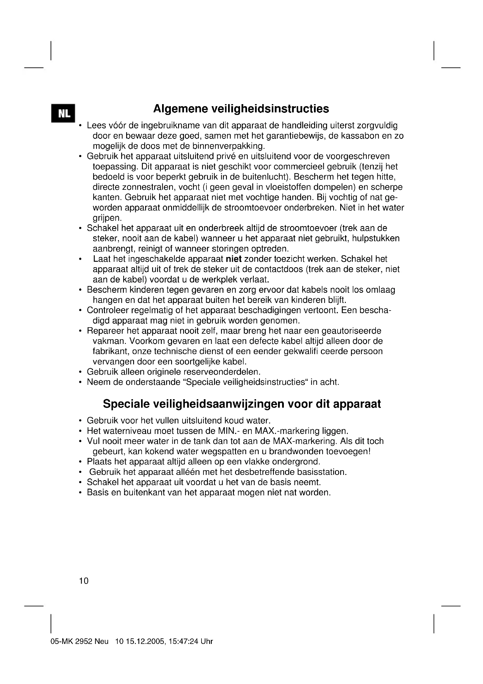 - Basis en buitenkant van het apparaat mogen niet nat worden. 05-MK 2952 Neu 10 15.12.2005, 15:47:24 UhrNL