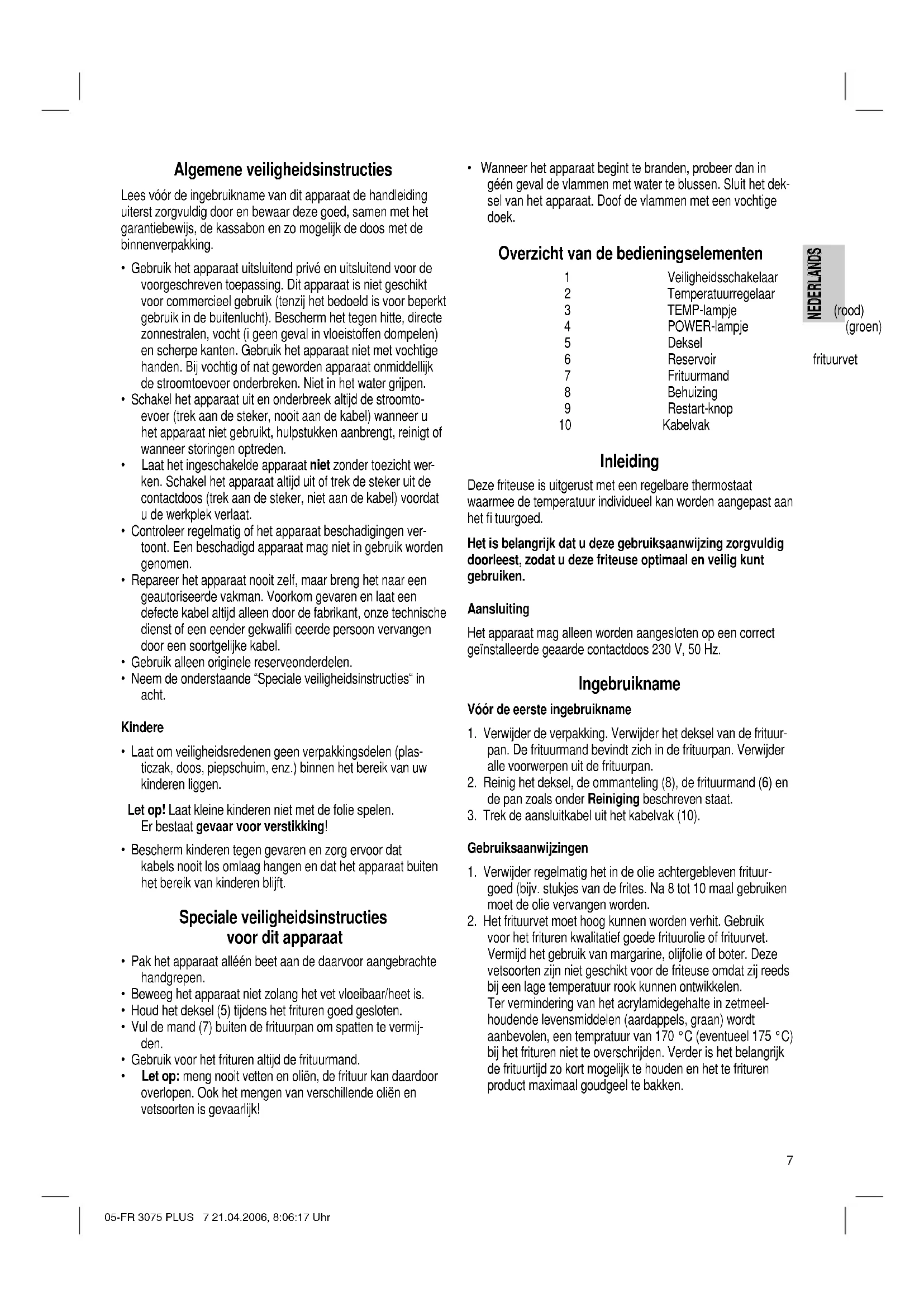 - Laat de frituurpan eerst volledig afkoelen voordat u op de rode „RESTART“-knop (9) aan de binnenzijde van het bestu- ringselement drukt om de frituurpan opnieuw te gebruiken. Gebruik daarvoor een spits voorwerp. 05-FR 3075 PLUS 8 21.04.2006, 8:06:19 UhrNEDERLANDS